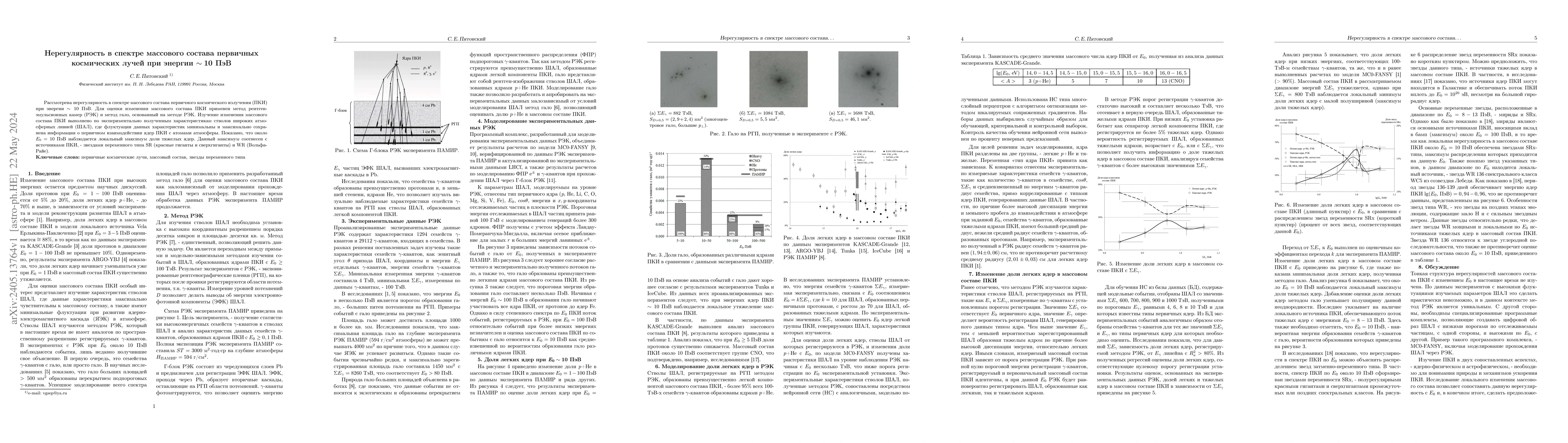 This paper investigates irregularities in the mass composition spectrum of primary cosmic rays at ~10 PeV using the X-ray emulsion chamber method and halo-method, revealing a local maximum in the fraction of heavy nuclei correlated with variable star sources such as red giants, super-giants, and Wolf-Rayet stars.