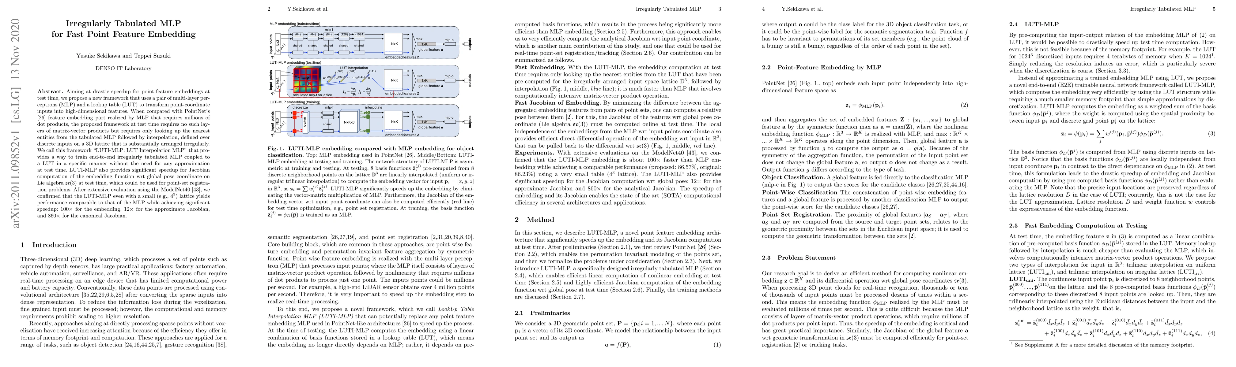 Aiming at drastic speedup for point-feature embeddings at test time, we propose a new framework that uses a pair of multi-layer perceptrons (MLP) and a lookup table (LUT) to transform point-coordinate inputs into high-dimensional features. When compared with PointNet's feature embedding part realized by MLP that requires millions of dot products, the proposed framework at test time requires no such layers of matrix-vector products but requires only looking up the nearest entities from the tabulated MLP followed by interpolation, defined over discrete inputs on a 3D lattice that is substantially arranged irregularly. We call this framework LUTI-MLP: LUT Interpolation ML that provides a way to train end-to-end irregularly tabulated MLP coupled to a LUT in a specific manner without the need for any approximation at test time. LUTI-MLP also provides significant speedup for Jacobian computation of the embedding function wrt global pose coordinate on Lie algebra $\mathfrak{se}(3)$ at test time, which could be used for point-set registration problems. After extensive evaluation using the ModelNet40, we confirmed that the LUTI-MLP even with a small (e.g., $4^3$) lattice yields performance comparable to that of the MLP while achieving significant speedup: $100\times$ for the embedding, $12\times$ for the approximate Jacobian, and $860\times$ for the canonical Jacobian.