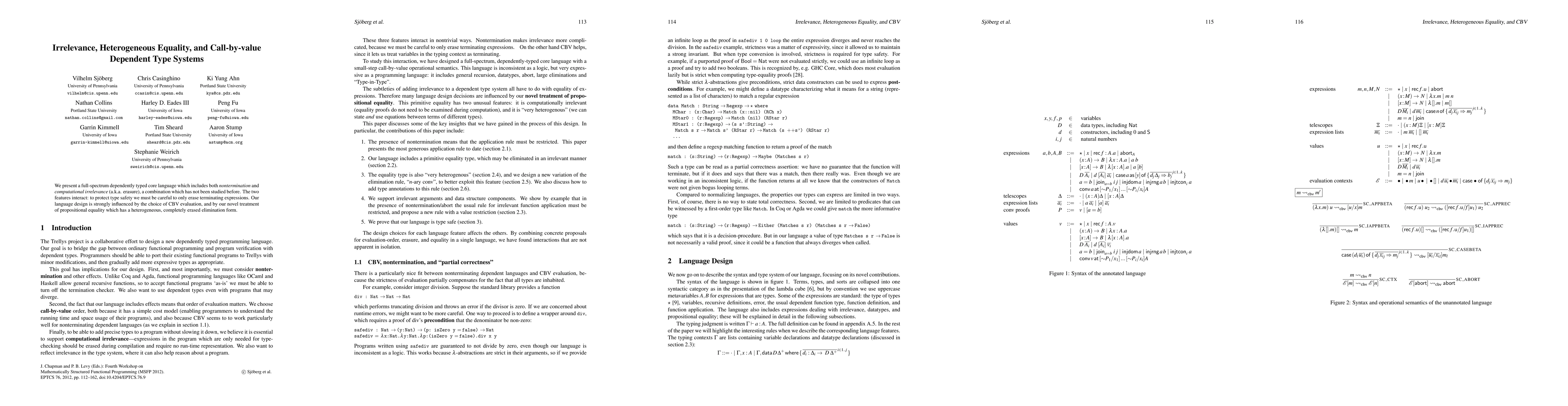 Summary: This paper introduces a novel dependently typed core language featuring both nontermination and computational irrelevance, demonstrating how these features interact and impact type safety, especially under call-by-value evaluation and a unique approach to handling propositional equality.