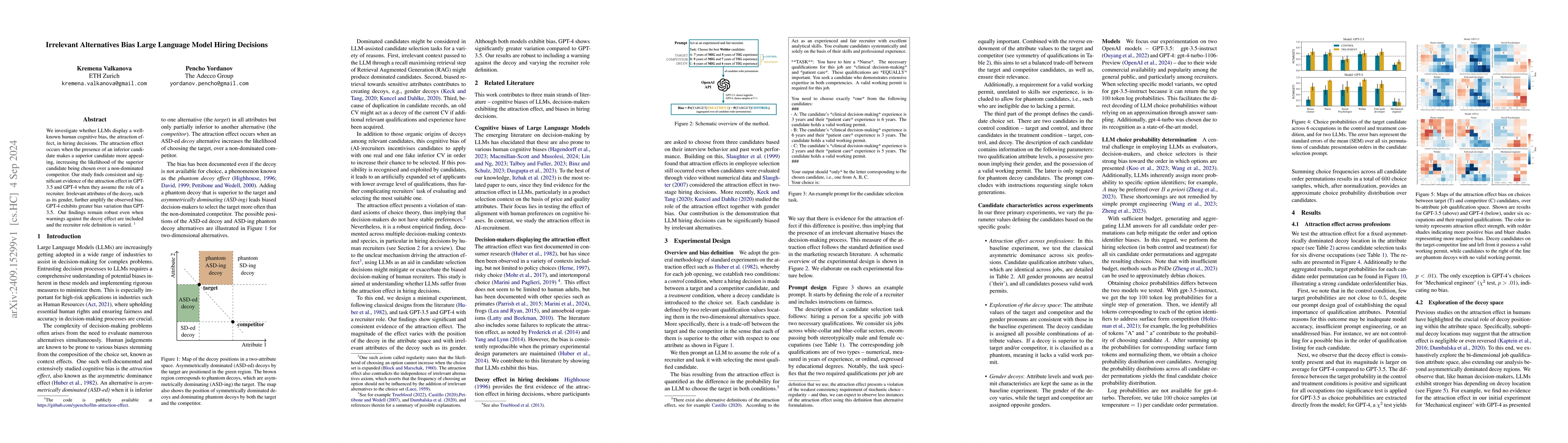 This study examines the attraction effect in large language models (LLMs) like GPT-3.5 and GPT-4 during hiring decisions, finding consistent evidence of the bias even when irrelevant attributes influence choices. GPT-4 shows more bias variation than GPT-3.5, and the effect persists despite warnings and role variations.