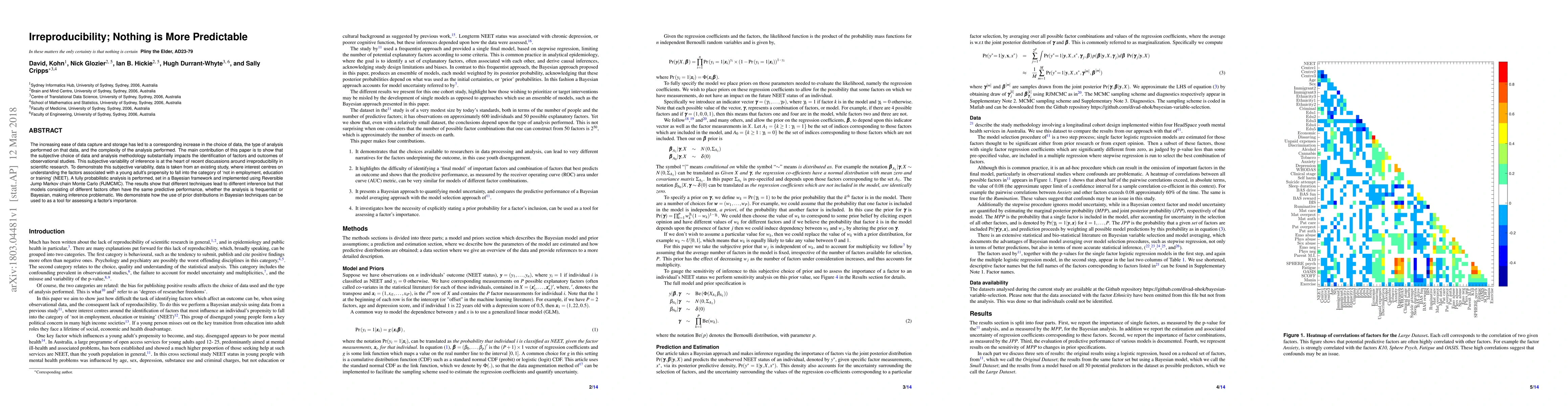 The increasing ease of data capture and storage has led to a corresponding increase in the choice of data, the type of analysis performed on that data, and the complexity of the analysis performed. The main contribution of this paper is to show that the subjective choice of data and analysis methodology substantially impacts the identification of factors and outcomes of observational studies. This subjective variability of inference is at the heart of recent discussions around irreproducibility in scientific research. To demonstrate this subjective variability, data is taken from an existing study, where interest centres on understanding the factors associated with a young adult's propensity to fall into the category of `not in employment, education or training' (NEET). A fully probabilistic analysis is performed, set in a Bayesian framework and implemented using Reversible Jump Markov chain Monte Carlo (RJMCMC). The results show that different techniques lead to different inference but that models consisting of different factors often have the same predictive performance, whether the analysis is frequentist or Bayesian, making inference problematic. We demonstrate how the use of prior distributions in Bayesian techniques can be used to as a tool for assessing a factor's importance.