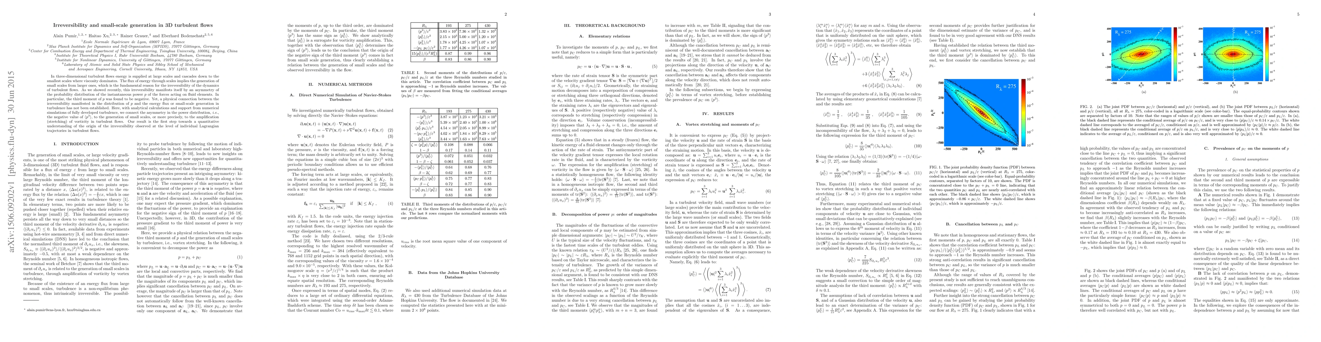 This paper establishes a physical connection between the asymmetry in the probability distribution of instantaneous power in turbulent flows and the generation of small scales, specifically highlighting the amplification of vorticity. The negative third moment of power distribution is linked to the irreversibility in turbulence dynamics.