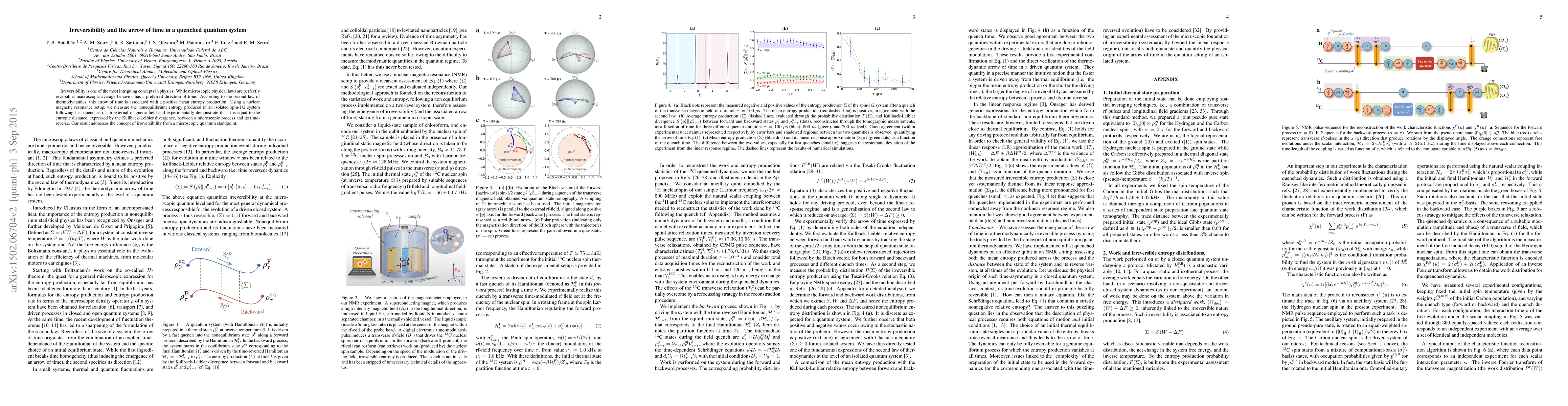 This paper investigates the irreversibility and the arrow of time in a quenched quantum system, demonstrating through nuclear magnetic resonance that the nonequilibrium entropy produced matches the entropic distance between a microscopic process and its time-reverse, thus providing insight into the microscopic origins of thermodynamic irreversibility.