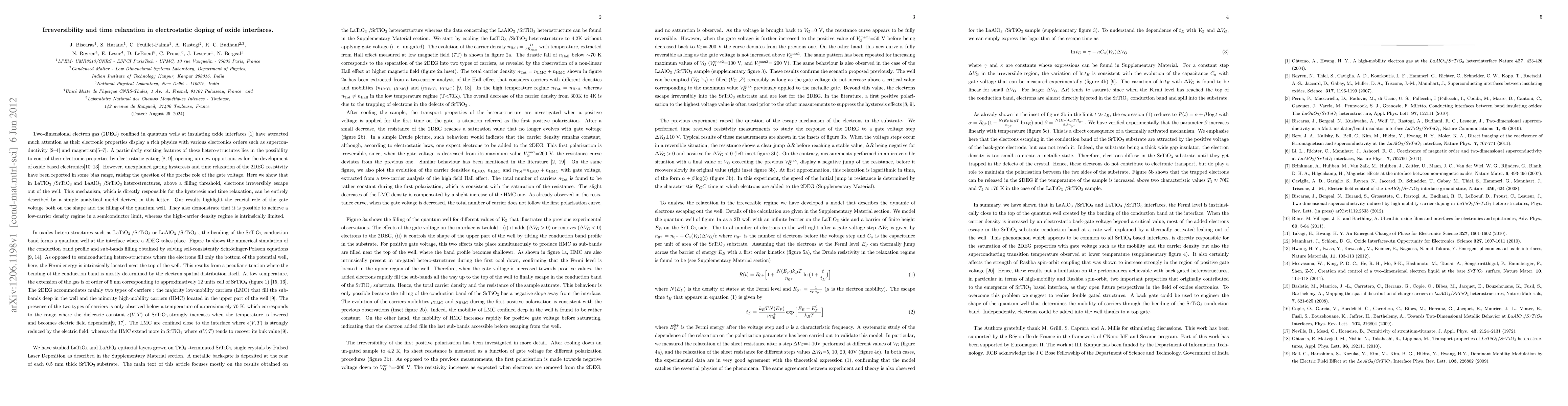 This paper investigates the irreversibility and time relaxation in electrostatic doping of oxide interfaces, revealing that electrons escape the quantum well above a certain filling threshold, causing gating hysteresis and time relaxation. The findings are explained by a simple analytical model, emphasizing the gate voltage's crucial role in shaping and filling the quantum well.