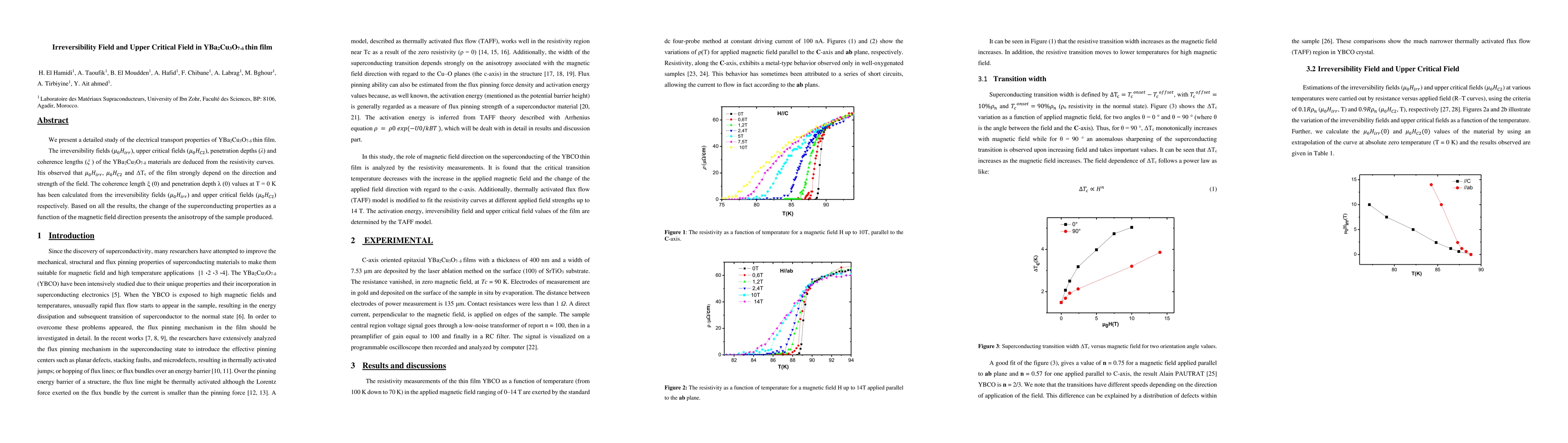 This paper investigates the electrical transport properties of YBa2Cu3O7-{\delta} thin films, determining irreversibility fields, upper critical fields, penetration depths, and coherence lengths from resistivity curves. The study reveals strong dependence of these properties on the magnetic field direction and strength, highlighting the anisotropy of the superconducting material.