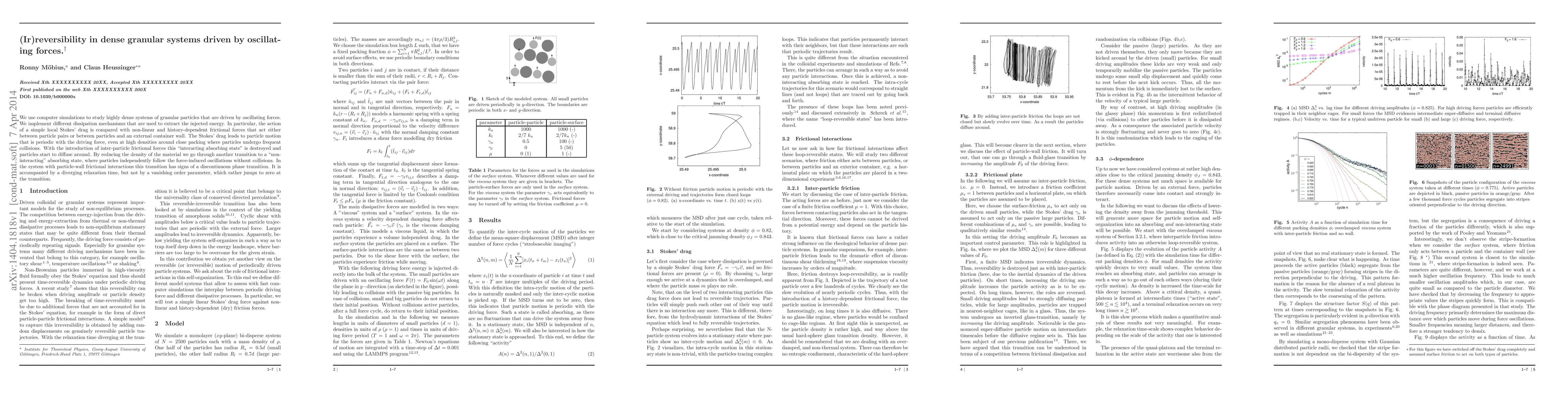 We use computer simulations to study highly dense systems of granular particles that are driven by oscillating forces. We implement different dissipation mechanisms that are used to extract the injected energy. In particular, the action of a simple local Stokes' drag is compared with non-linear and history-dependent frictional forces that act either between particle pairs or between particles and an external container wall. The Stokes' drag leads to particle motion that is periodic with the driving force, even at high densities around close packing where particles undergo frequent collisions. With the introduction of inter-particle frictional forces this "interacting absorbing state" is destroyed and particles start to diffuse around. By reducing the density of the material we go through another transition to a "non-interacting" absorbing state, where particles independently follow the force-induced oscillations without collisions. In the system with particle-wall frictional interactions this transition has signs of a discontinuous phase transition. It is accompanied by a diverging relaxation time, but not by a vanishing order parameter, which rather jumps to zero at the transition.
