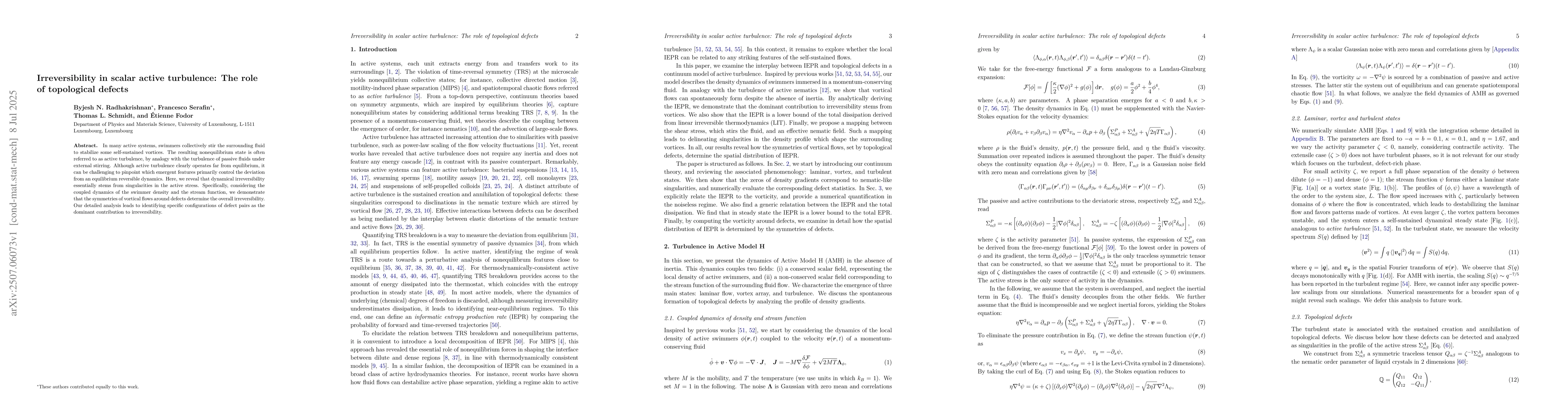 The paper presents a detailed analysis of the irreversibility in active turbulence, identifying the role of topological defects and their symmetries in determining the overall irreversibility, and provides analytical derivations for the profile of IEPR around +12 and -12 defects.