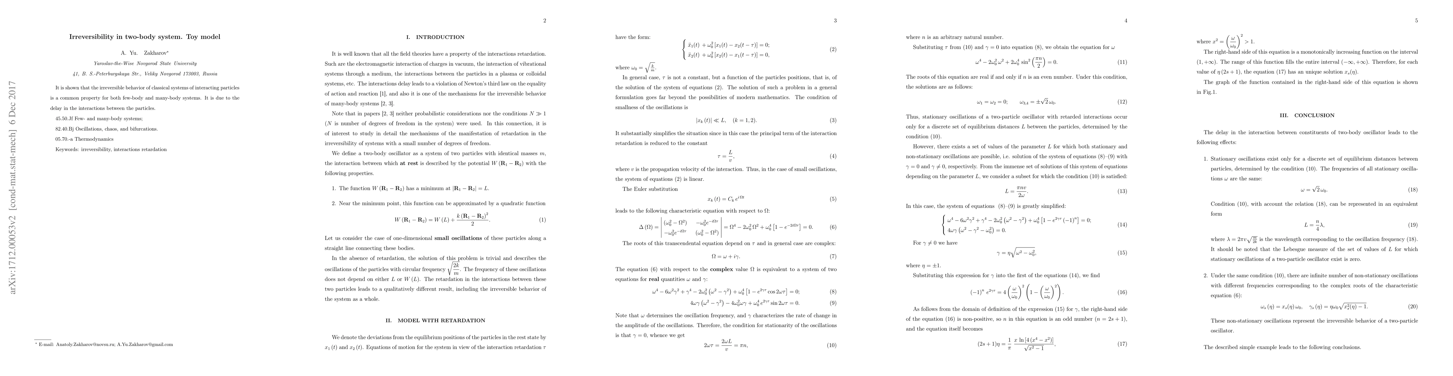 It is shown that the irreversible behavior of classical systems of interacting particles is a common property for both few-body and many-body systems. It is due to the delay in the interactions between the particles. PACS: 45.50.Jf Few- and many-body systems; 82.40.Bj Oscillations, chaos, and bifurcations; 05.70.-a Thermodynamics. Keywords: irreversibility, interactions retardation.