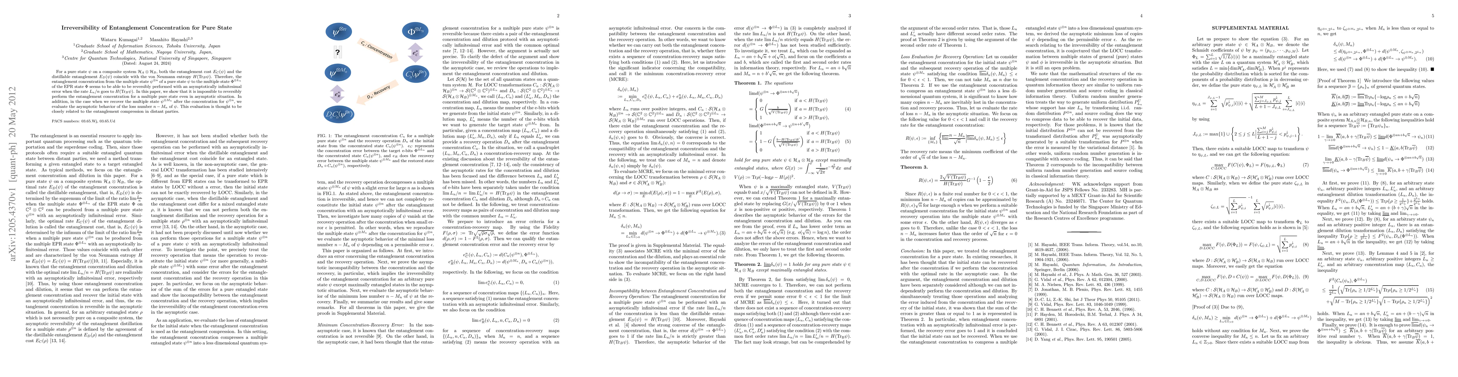 This paper demonstrates that entanglement concentration for pure states cannot be reversibly performed, even asymptotically, despite initial appearances suggesting otherwise. It also evaluates the asymptotic behavior of the loss number when attempting to recover the original pure state after concentration, highlighting its relevance to entanglement compression.