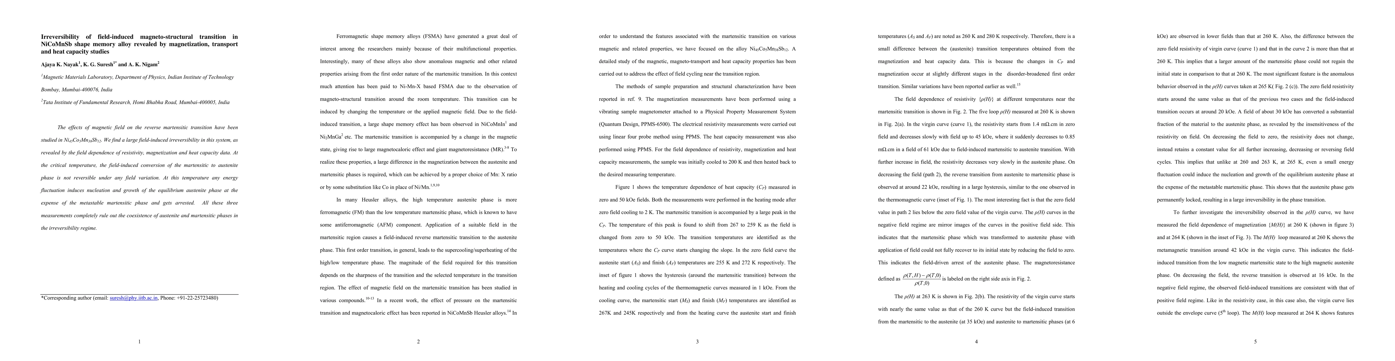 The effects of magnetic field on the martensitic transition have been studied in Ni45Co5Mn38Sb12. We find a large field-induced irreversibility in this system, as revealed by the field dependence of resistivity, magnetization, and heat capacity data. At the critical temperature, the field-induced conversion of the martensitic to austenite phase is not reversible under any field variation. At this temperature any energy fluctuation induces nucleation and growth of the equilibrium austenite phase at the expense of the metastable martensitic phase and gets arrested. All these three measurements completely rule out the coexistence of austenite and martensitic phases in the irreversibility regime.