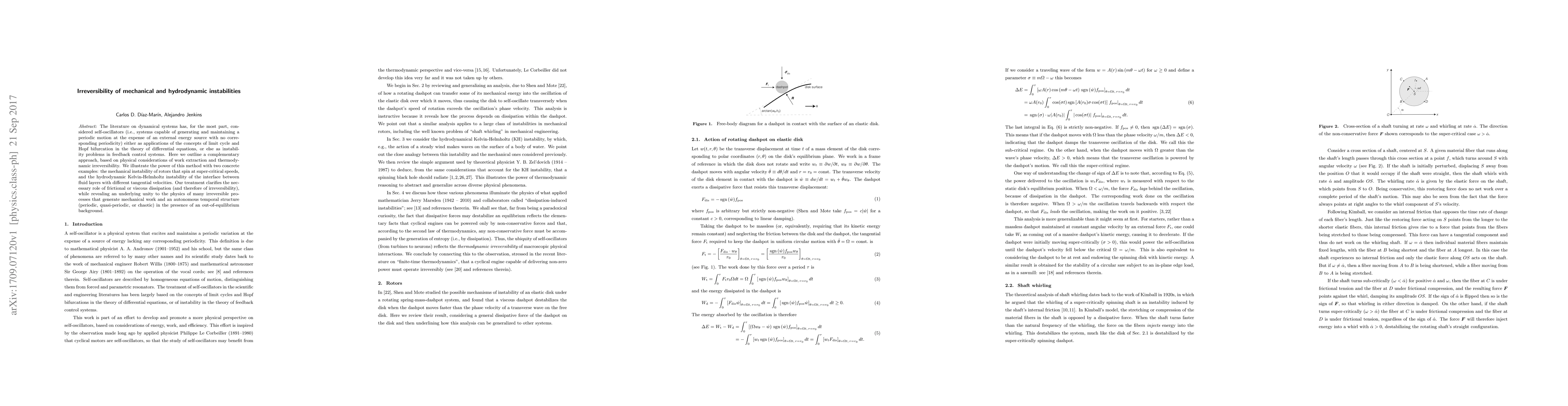 The literature on dynamical systems has, for the most part, considered self-oscillators (i.e., systems capable of generating and maintaining a periodic motion at the expense of an external energy source with no corresponding periodicity) either as applications of the concepts of limit cycle and Hopf bifurcation in the theory of differential equations, or else as instability problems in feedback control systems. Here we outline a complementary approach, based on physical considerations of work extraction and thermodynamic irreversibility. We illustrate the power of this method with two concrete examples: the mechanical instability of rotors that spin at super-critical speeds, and the hydrodynamic Kelvin-Helmholtz instability of the interface between fluid layers with different tangential velocities. Our treatment clarifies the necessary role of frictional or viscous dissipation (and therefore of irreversibility), while revealing an underlying unity to the physics of many irreversible processes that generate mechanical work and an autonomous temporal structure (periodic, quasi-periodic, or chaotic) in the presence of an out-of-equilibrium background.