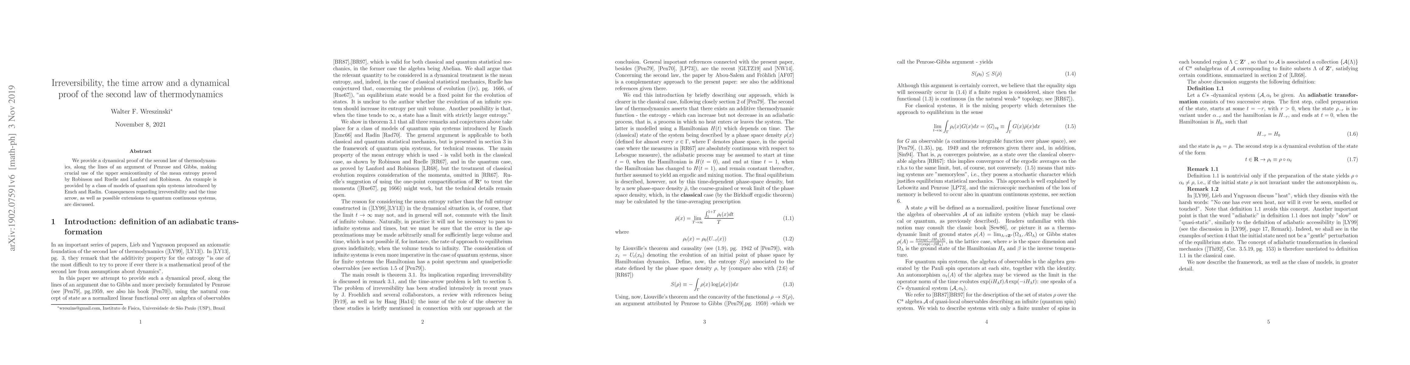 We provide a dynamical proof of the second law of thermodynamics, along the lines of an argument of Penrose and Gibbs, making crucial use of the upper semicontinuity of the mean entropy proved by Robinson and Ruelle and Lanford and Robinson. An example is provided by a class of models of quantum spin systems introduced by Emch and Radin. Consequences regarding irreversibility and the time arrow, as well as possible extensions to quantum continuous systems are discussed.