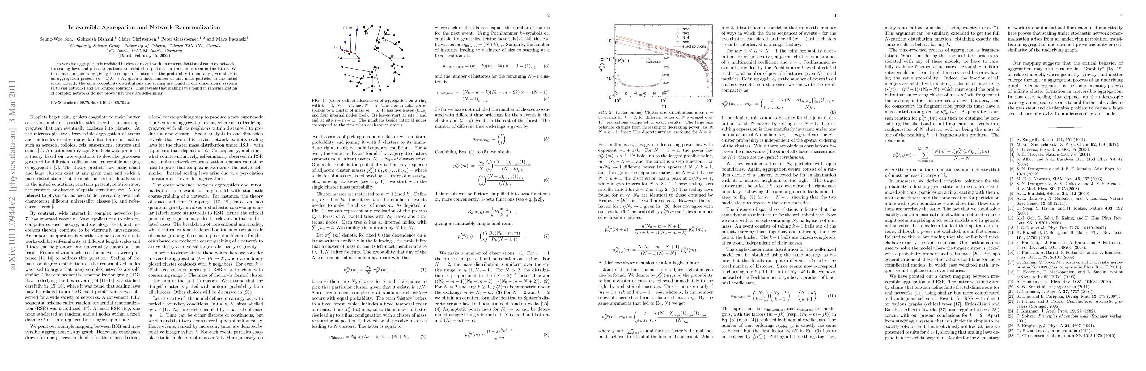 Irreversible aggregation is revisited in view of recent work on renormalization of complex networks. Its scaling laws and phase transitions are related to percolation transitions seen in the latter. We illustrate our points by giving the complete solution for the probability to find any given state in an aggregation process $(k+1)X\to X$, given a fixed number of unit mass particles in the initial state. Exactly the same probability distributions and scaling are found in one dimensional systems (a trivial network) and well-mixed solutions. This reveals that scaling laws found in renormalization of complex networks do not prove that they are self-similar.