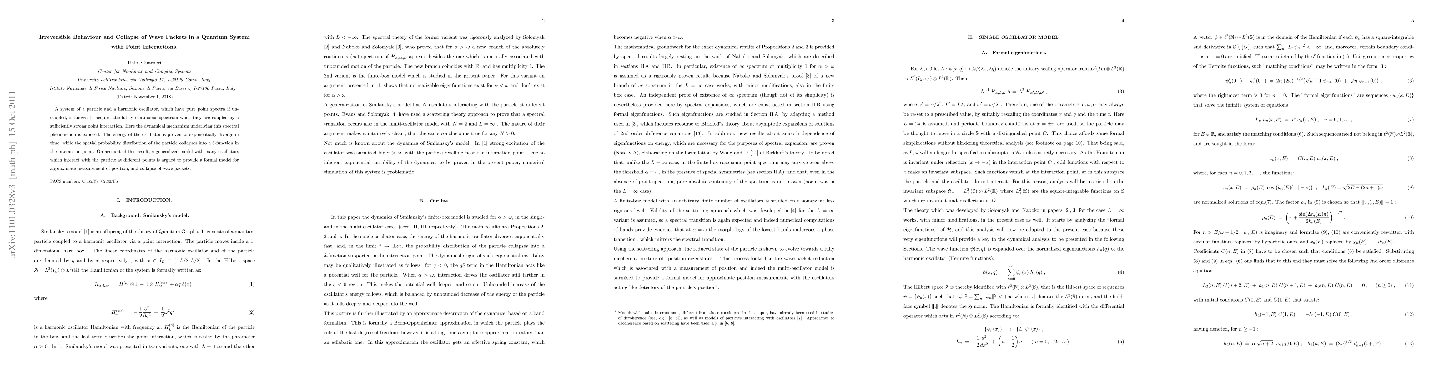 A system of a particle and a harmonic oscillator, which have pure point spectrum if uncoupled, is known to acquire absolutely continuous spectrum when the particle and the oscillator are coupled by a sufficiently strong point interaction. Here the simple dynamical mechanism underlying this phenomenon is exposed. The energy of the oscillator is proven to exponentially diverge in time, while the spatial probability distribution of the particle collapses into a delta function in the interaction point. On account of this result, a generalized model with many oscillators which interact with the particle at different points is argued to provide a formal model for approximate measurement of position, and collapse of wave packets.