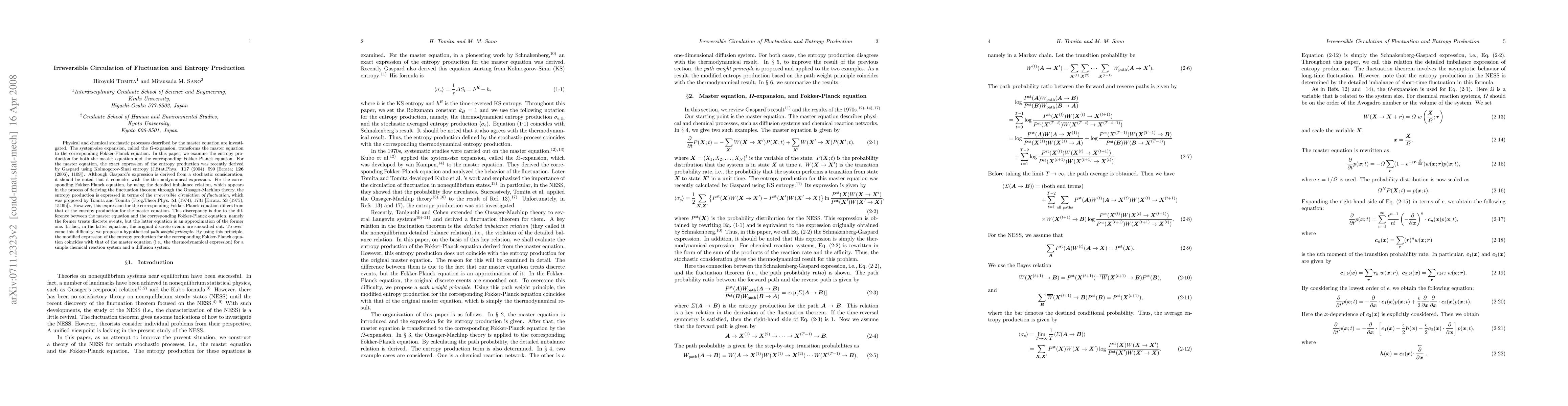 Physical and chemical stochastic processes described by the master equation are investigated. In this paper, we examine the entropy production both for the master equation and for the corresponding Fokker-Planck equation. For the master equation, the exact expression of the entropy production was recently derived by Gaspard using the Kolmogorov-Sinai entropy ({\em J.Stat.Phys.}, \textbf{117} (2004), 599; [Errata; \textbf{126} (2006), 1109 ]). Although Gaspard's expression is derived from a stochastic consideration, it should be noted that Gaspard's expression conincides with the thermodynamical expression. For the corresponding Fokker-Planck equation, by using the detailed imbalance relation which appears in the derivation process of the fluctuation theorem through the Onsger-Machlup theory, the entropy production is expressed in terms of the {\em irreversible circulation of fluctuation}, which was proposed by Tomita and Tomita ({\em Prog.Theor.Phys.}, \textbf{51} (1974), 1731). However, this expression for the corresponding Fokker-Planck equation differs from that of the entropy production for the master equation. This discrepancy is due to the difference between the master equation and the corresponding Fokker-Planck equation, namely the former treats discrete events, but the latter equation is an approximation of the former one. In fact, in the latter equation, the original discrete events are smoothed out. To overcome this difficulty, we propose the {\em path weight principle}. By using this principle, the modified expression of the entropy production for the corresponding Fokker-Planck equation coincides with that of the master equation (i.e., the thermodynamical expression) for a simple chemical reaction system and a diffusion system.