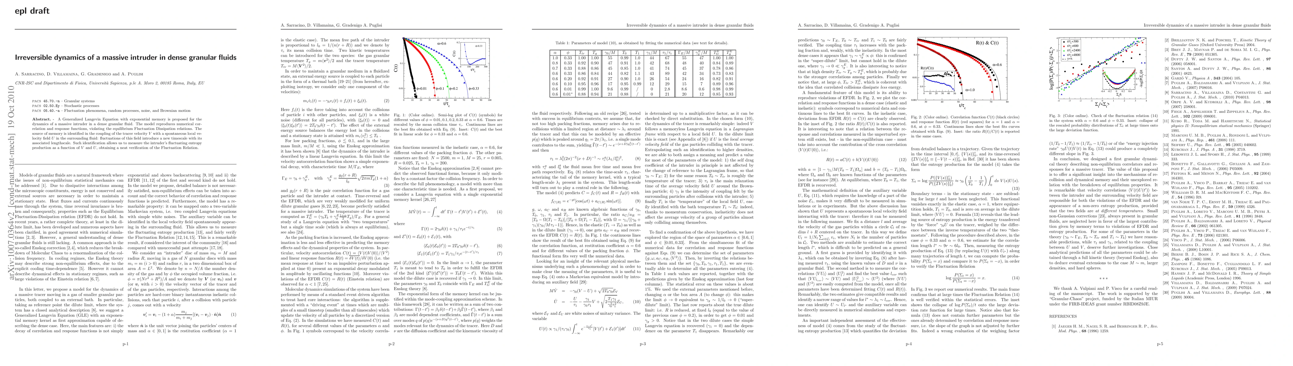 This paper proposes a Generalized Langevin Equation to model the dynamics of a massive intruder in dense granular fluids, revealing non-equilibrium behavior that violates equilibrium Fluctuation Dissipation relations. The model identifies the source of memory in the coupling between the intruder's velocity and a spontaneous local velocity field, enabling measurement of fluctuating entropy production and verifying the Fluctuation Relation.