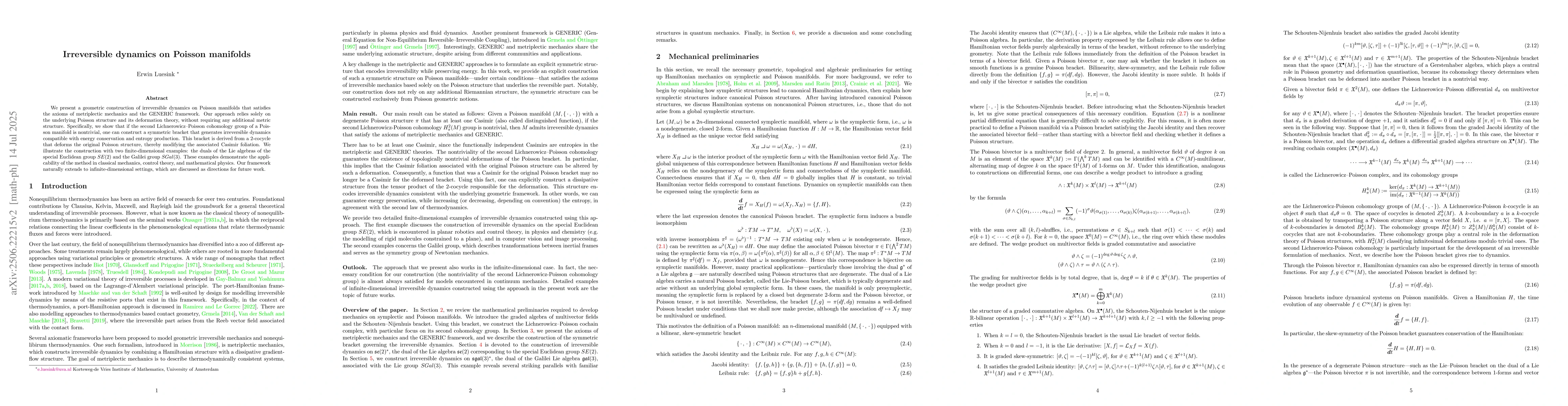 We present a geometric construction of irreversible dynamics on Poisson manifolds that satisfies the axioms of metriplectic mechanics and the GENERIC framework. Our approach relies solely on the underlying Poisson structure and its deformation theory, without requiring any additional metric structure. Specifically, we show that if the second Lichnerowicz-Poisson cohomology group of a Poisson manifold is nontrivial, one can construct a symmetric bracket that generates irreversible dynamics compatible with energy conservation and entropy production. This bracket is derived from a 2-cocycle that deforms the original Poisson structure, thereby modifying the associated Casimir foliation. We illustrate the construction with two finite-dimensional examples, the duals of the Lie algebras of the special Euclidean group SE(2) and the Galilei group SGal(3). These examples demonstrate the applicability of the method in classical mechanics, control theory, and mathematical physics. Our framework naturally extends to infinite-dimensional settings, which are discussed as directions for future work.