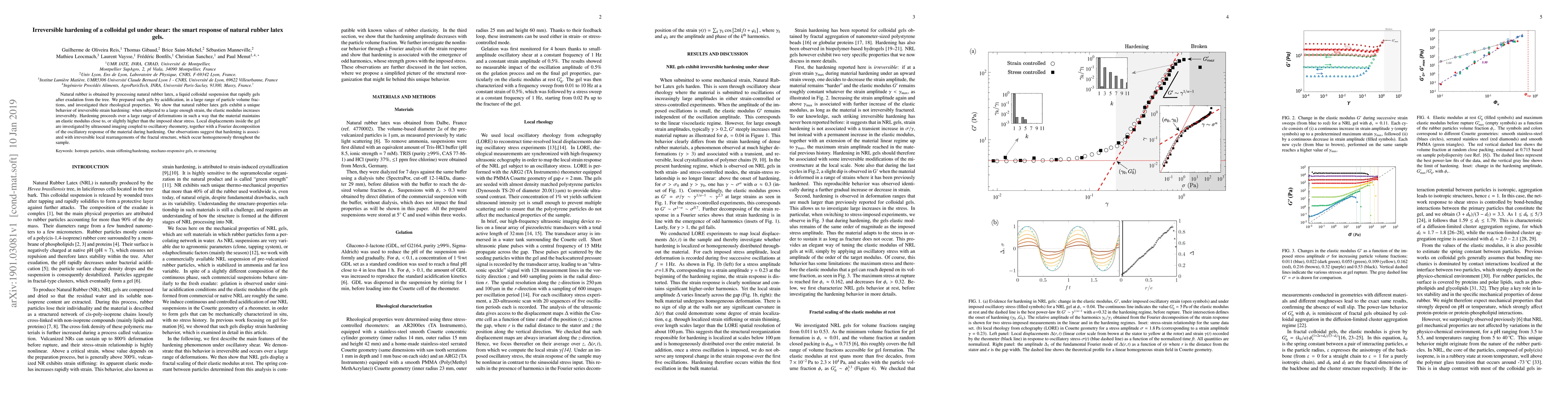 This paper investigates the rheological behavior of natural rubber latex gels under shear, revealing an irreversible strain hardening phenomenon where the elastic modulus increases permanently after a critical strain. The study uses ultrasound imaging and rheometry to show that this hardening is due to irreversible local rearrangements of the gel's fractal structure.