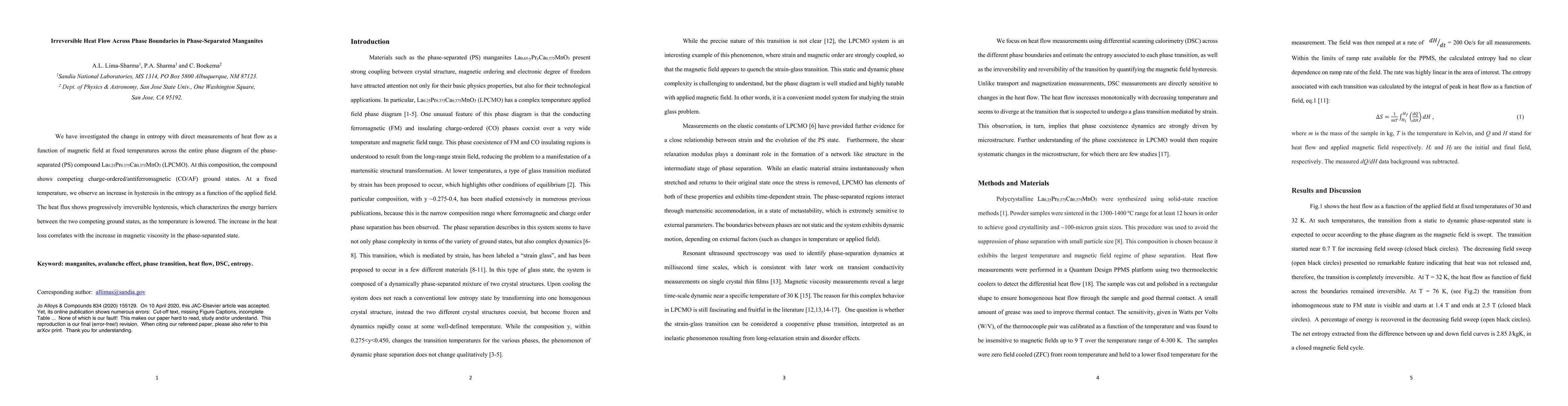We have investigated the change in entropy with direct measurements of heat flow as a function of magnetic field at fixed temperatures across the entire phase diagram of the phase-separated (PS) compound La$_{0.25}$Pr$_{0.375}$Ca$_{0.375}$MnO$_3$ (LPCMO). At this composition, the compound shows competing charge-ordered/antiferromagnetic (CO/AF) ground states. At a fixed temperature, we observe an increase in hysteresis in the entropy as a function of the applied field. The heat flux shows progressively irreversible hysteresis, which characterizes the energy barriers between the two competing ground states, as the temperature is lowered. The increase in the heat loss correlates with the increase in magnetic viscosity in the phase-separated state. Keywords: manganites, avalanche effect, phase transition, heat flow, DSC, entropy. Corresponding author: [email protected] . On 10 April 2020, this JAC-Elsevier article was accepted. Yet, its online publication shows numerous errors: Cut-off text, missing Figure Captions, incomplete Table ... None of which is our fault! This makes our paper hard to read, study and/or understand. This reproduction is our final (error-free!) revision. When citing our refereed paper, please also refer to this arXiv print. Thank you for understanding