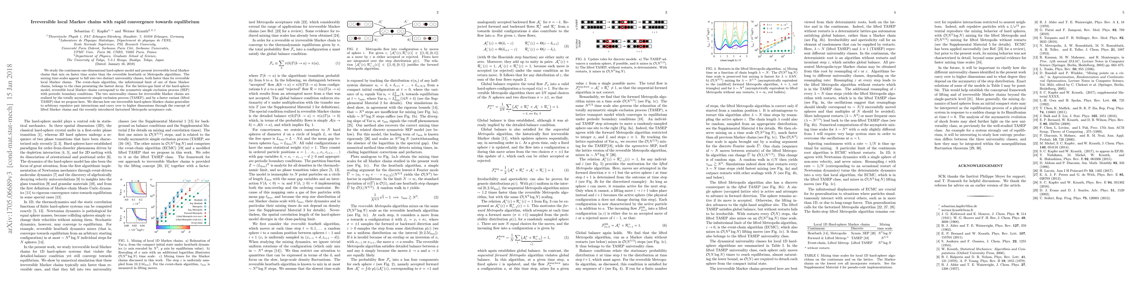 This paper investigates irreversible local Markov chains for the one-dimensional hard-sphere model, demonstrating faster mixing times compared to reversible algorithms. Two distinct universality classes of faster irreversible Markov chains are identified, with the fastest decay achieved by the event-chain algorithm.