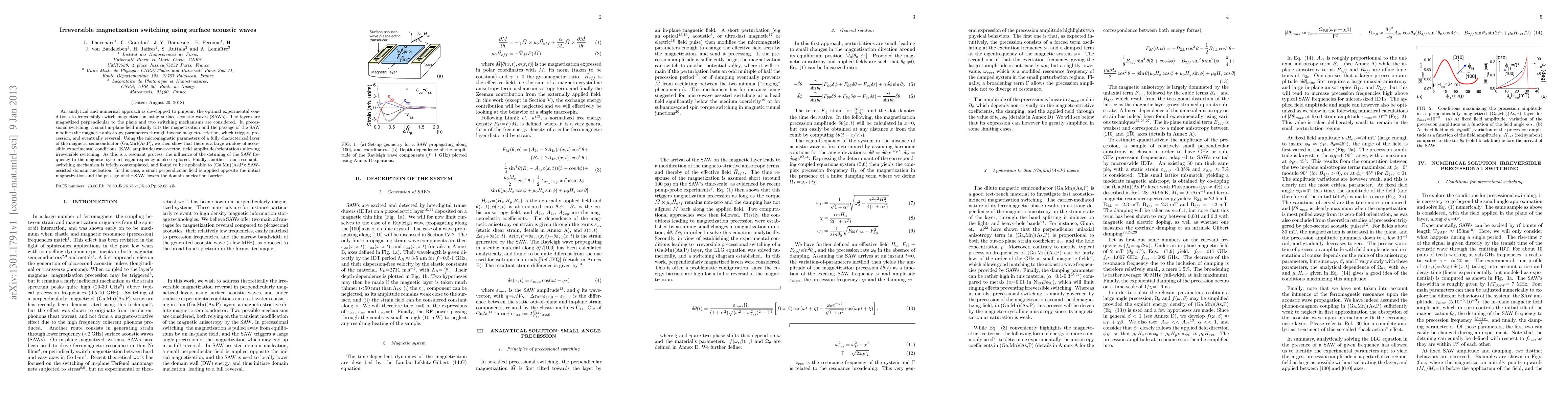 This paper develops an analytical and numerical method to determine optimal conditions for irreversible magnetization switching using surface acoustic waves (SAWs). It explores two mechanisms: precessional switching via inverse magneto-striction and non-resonant domain nucleation, demonstrating a wide range of feasible experimental parameters for the magnetic semiconductor (Ga,Mn)(As,P).
