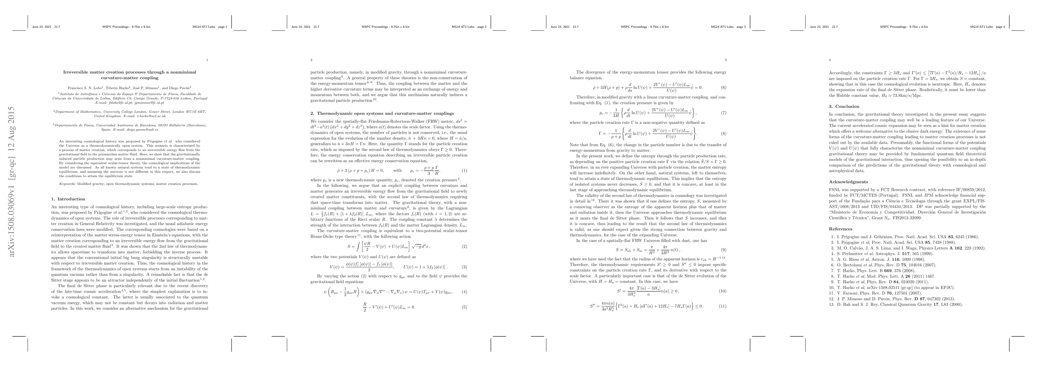 An interesting cosmological history was proposed by Prigogine {\it et al.} who considered the Universe as a thermodynamically open system. This scenario is characterized by a process of matter creation, which corresponds to an irreversible energy flow from the gravitational field to the pressureless matter fluid. Here, we show that the gravitationally induced particle production may arise from a nonminimal curvature-matter coupling. By considering the equivalent scalar-tensor theory, the cosmological implications of the model are discussed. As all known natural systems tend to a state of thermodynamic equilibrium, and assuming the universe is not different in this respect, we also discuss the conditions to attain the equilibrium state.