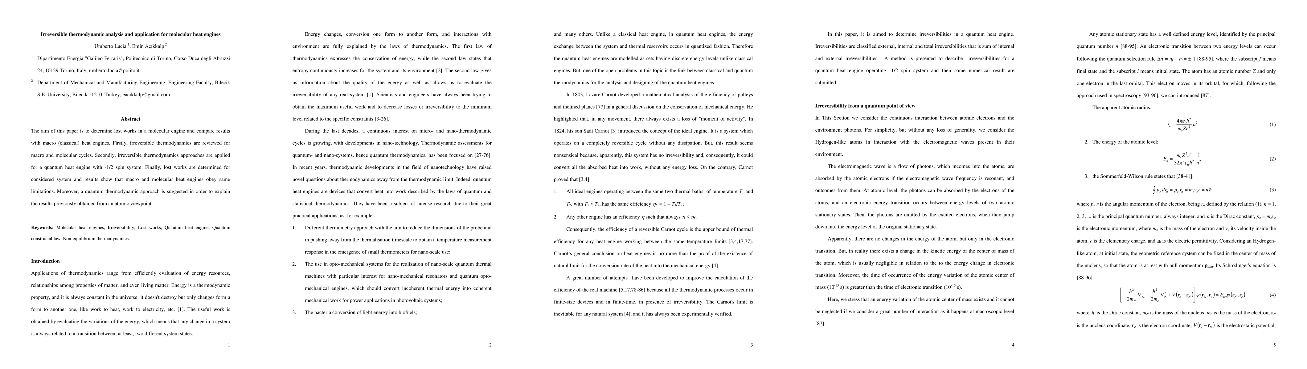 The paper introduces a quantum thermodynamic approach to analyze lost works in molecular heat engines, providing a theoretical framework for understanding irreversibilities at the atomic scale.