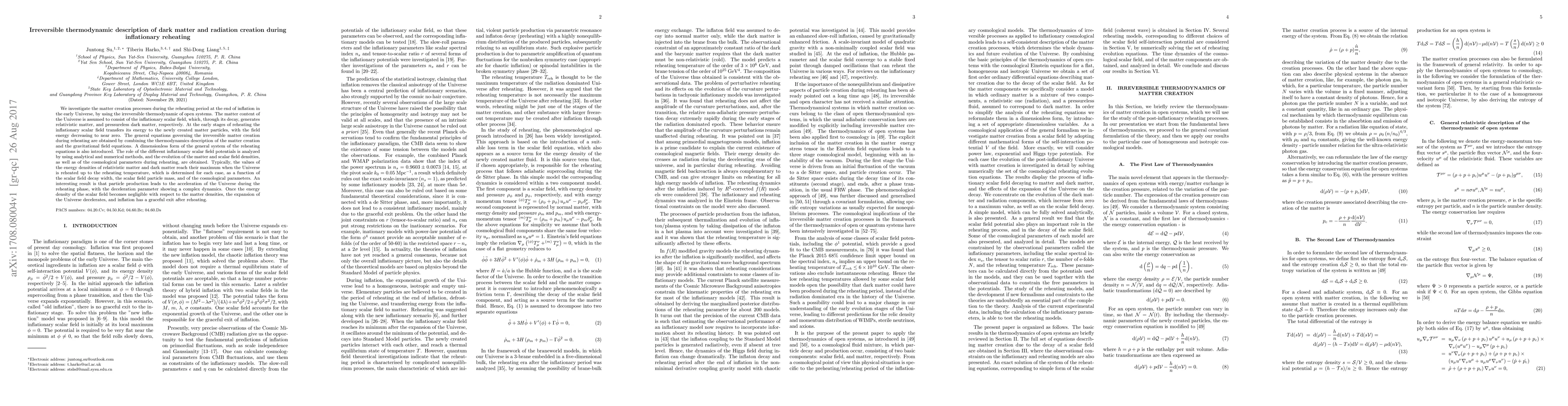 This paper uses irreversible thermodynamics to describe the creation of relativistic matter and pressureless dark matter during the inflationary reheating phase. It combines thermodynamic principles with gravitational field equations to derive equations governing matter creation, analyzing the dynamics of the inflationary scalar field and its potentials to determine the energy densities and cosmological parameters during reheating.