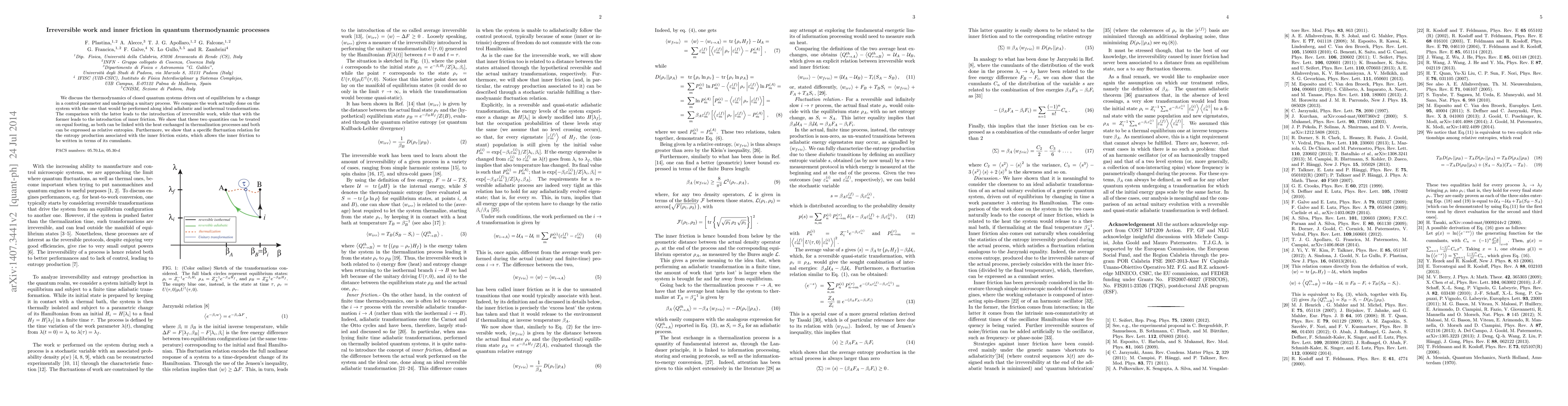 We discuss the thermodynamics of closed quantum systems driven out of equilibrium by a change in a control parameter and undergoing a unitary process. We compare the work actually done on the system with the one that would be performed along ideal adiabatic and isothermal transformations. The comparison with the latter leads to the introduction of irreversible work, while that with the former leads to the introduction of inner friction. We show that these two quantities can be treated on equal footing, as both can be linked with the heat exchanged in thermalization processes and both can be expressed as relative entropies. Furthermore, we show that a specific fluctuation relation for the entropy production associated with the inner friction exists, which allows the inner friction to be written in terms of its cumulants.