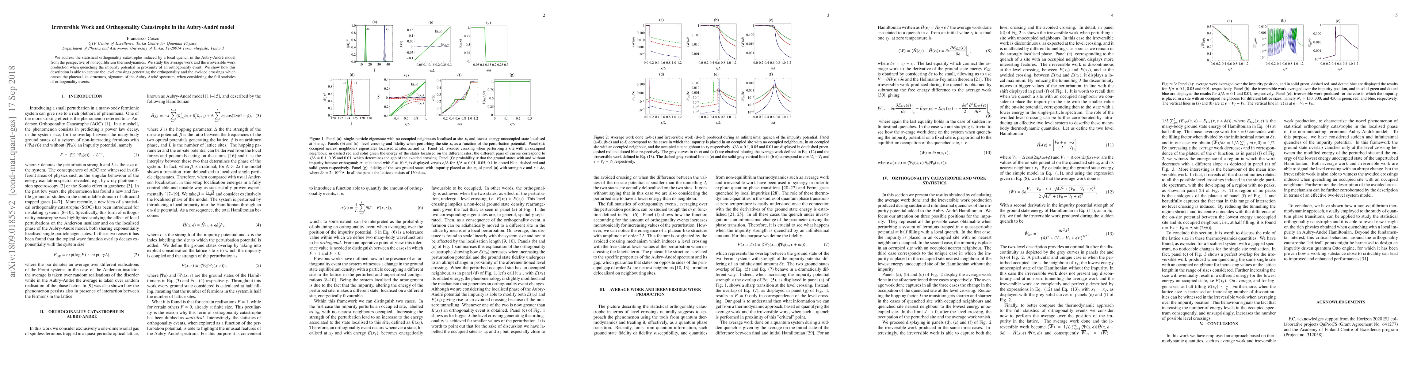 This paper investigates the statistical orthogonality catastrophe in the Aubry-Andr\'e model following a local quench, focusing on nonequilibrium thermodynamics. It analyzes average work and irreversible work production, revealing how these concepts capture level crossings and plateau-like structures in the model's spectrum.