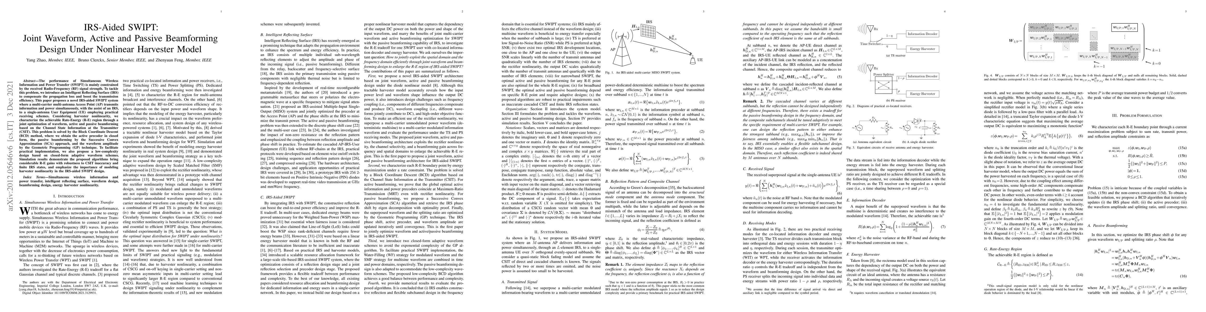 This paper proposes an IRS-aided SWIPT system to enhance transmission efficiency by using an Intelligent Reflecting Surface to compensate for propagation loss. It optimizes waveform, active, and passive beamforming under a nonlinear harvester model, achieving significant Rate-Energy gains through a combination of BCD, SCA, and GP techniques, with a low-complexity design for practical implementation.