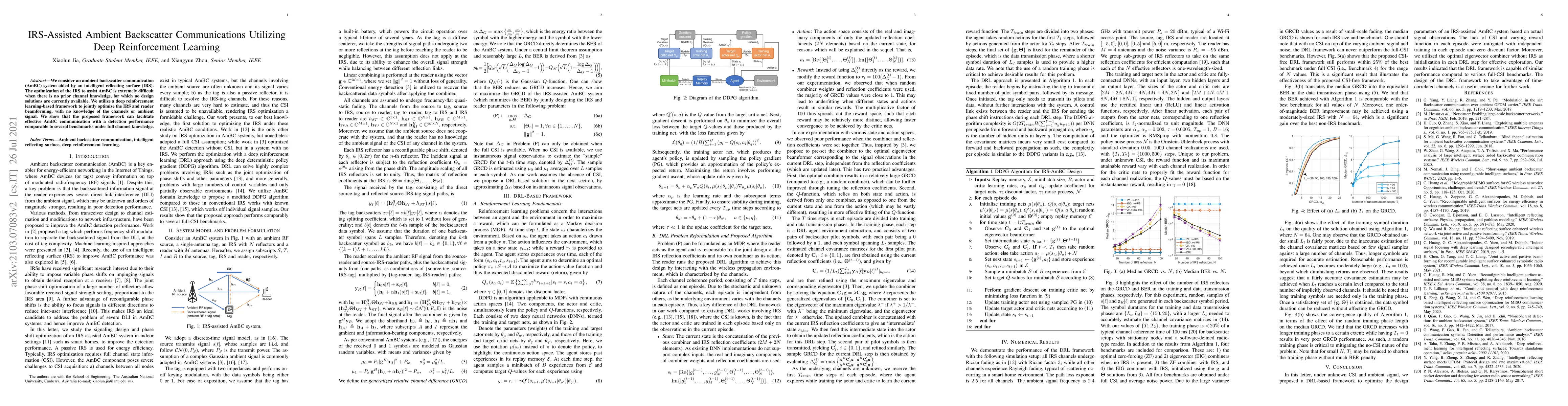 This paper proposes a deep reinforcement learning framework to optimize an intelligent reflecting surface (IRS) for ambient backscatter communication (AmBC) without prior channel knowledge, achieving detection performance comparable to systems with full channel knowledge. The approach jointly optimizes the IRS and reader beamforming to facilitate effective AmBC.