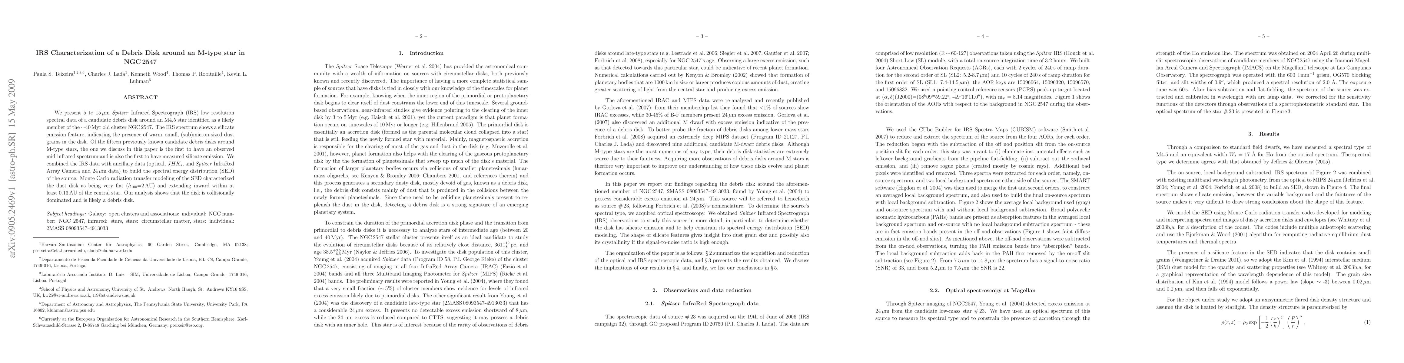 This paper reports the first mid-infrared spectrum of a debris disk around an M-type star in NGC2547, revealing silicate emission indicative of warm, small dust grains. The disk is characterized as very flat and collisionally dominated, extending inward close to the star.
