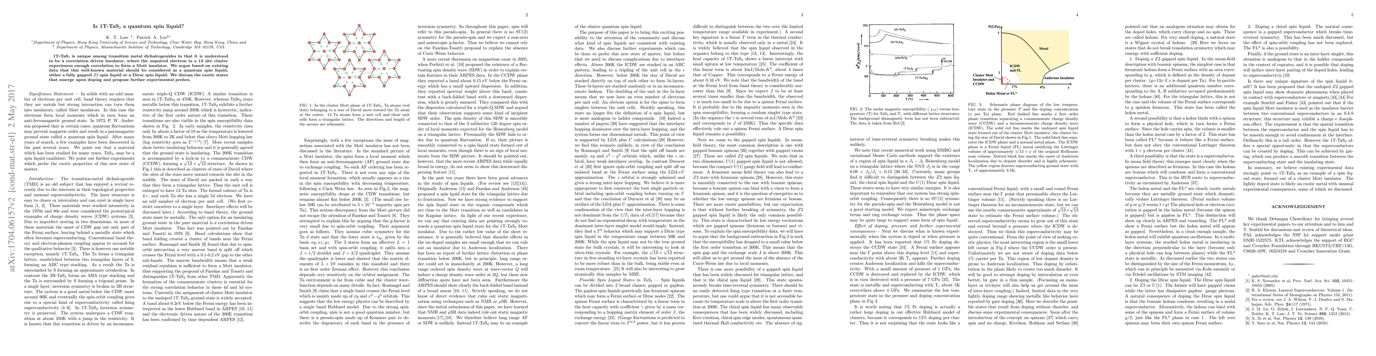 1T-TaS$_2$ is proposed to be a quantum spin liquid, either a fully gapped $Z2$ or Dirac spin liquid, based on its correlation-driven insulating properties and electron interactions. Further experiments are suggested to explore its exotic doped states.