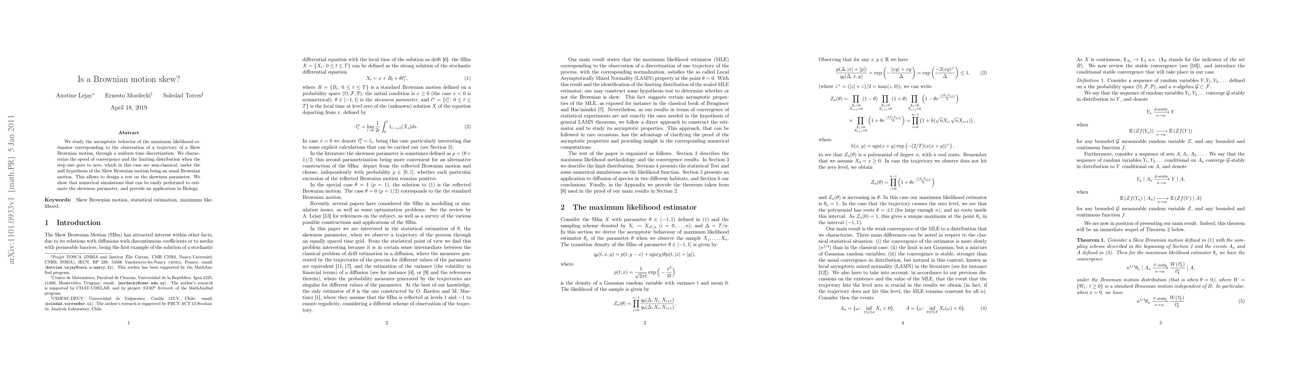 This paper investigates the asymptotic behavior of the maximum likelihood estimator for a Skew Brownian motion observed through uniform time discretization, revealing non-classical convergence speed and limiting distribution under the null hypothesis of it being a Brownian motion. It designs a test for the skewness parameter and demonstrates its application in estimating skewness in biological data.