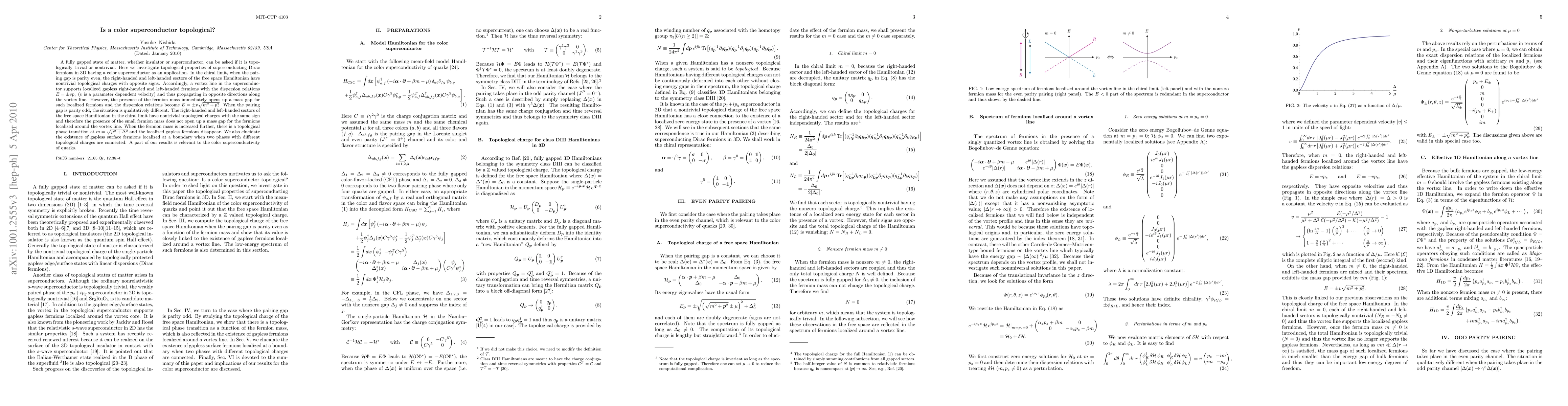 Researchers investigate topological properties of color superconductors in 3D, finding a phase transition at which gapless fermions disappear when fermion mass is increased.