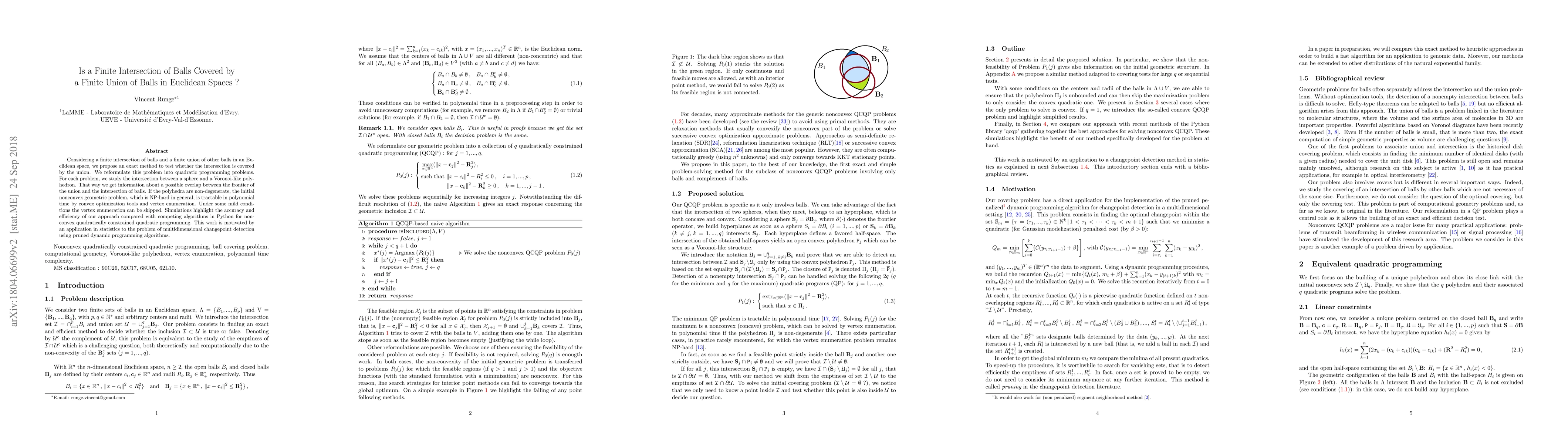 This paper proposes a method to determine if a finite intersection of balls in Euclidean space can be covered by a finite union of other balls, reformulating the problem into quadratic programming. The approach leverages convex optimization and vertex enumeration to solve the NP-hard problem efficiently, demonstrating accuracy and efficiency in simulations for multidimensional changepoint detection.
