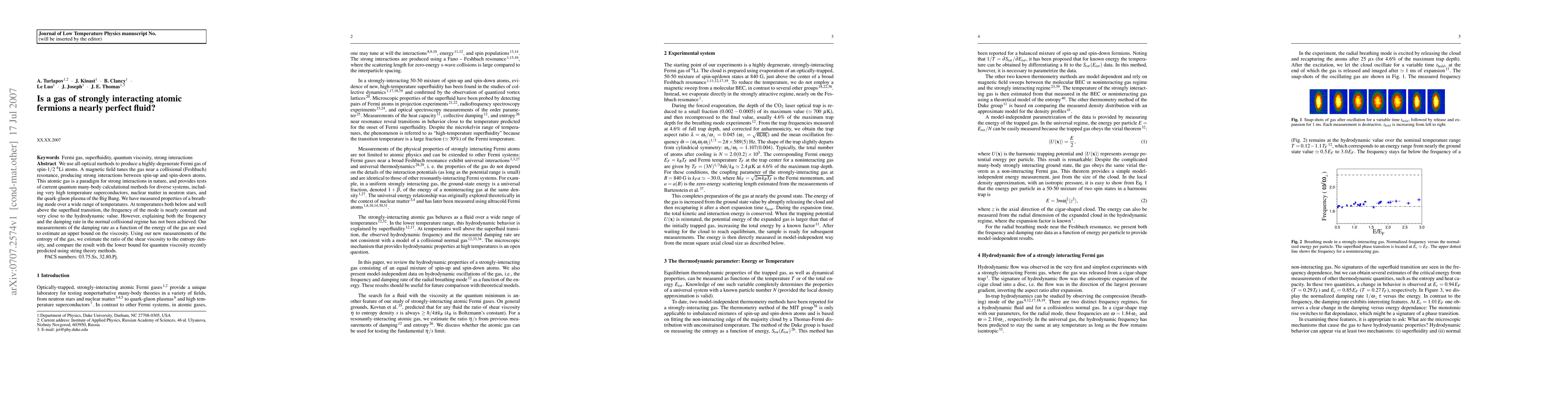 We use all-optical methods to produce a highly-degenerate Fermi gas of spin-1/2 $^6$Li atoms. A magnetic field tunes the gas near a collisional (Feshbach) resonance, producing strong interactions between spin-up and spin-down atoms. This atomic gas is a paradigm for strong interactions in nature, and provides tests of current quantum many-body calculational methods for diverse systems, including very high temperature superconductors, nuclear matter in neutron stars, and the quark-gluon plasma of the Big Bang. We have measured properties of a breathing mode over a wide range of temperatures. At temperatures both below and well above the superfluid transition, the frequency of the mode is nearly constant and very close to the hydrodynamic value. However, explaining both the frequency and the damping rate in the normal collisional regime has not been achieved. Our measurements of the damping rate as a function of the energy of the gas are used to estimate an upper bound on the viscosity. Using our new measurements of the entropy of the gas, we estimate the ratio of the shear viscosity to the entropy density, and compare the result with the lower bound for quantum viscosity recently predicted using string theory methods.