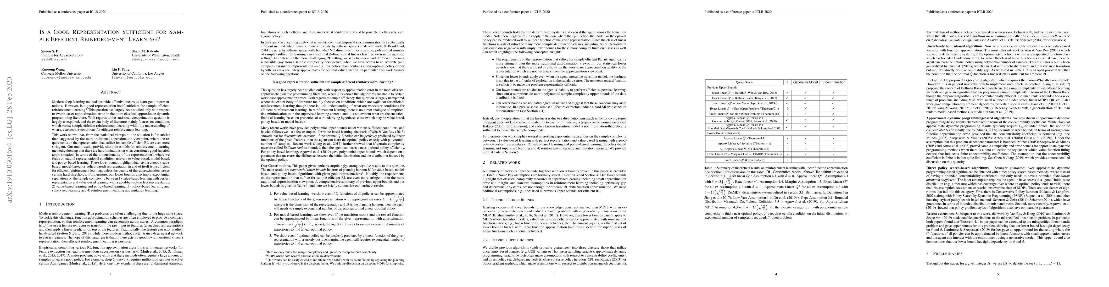 Modern deep learning methods provide effective means to learn good representations. However, is a good representation itself sufficient for sample efficient reinforcement learning? This question has largely been studied only with respect to (worst-case) approximation error, in the more classical approximate dynamic programming literature. With regards to the statistical viewpoint, this question is largely unexplored, and the extant body of literature mainly focuses on conditions which permit sample efficient reinforcement learning with little understanding of what are necessary conditions for efficient reinforcement learning. This work shows that, from the statistical viewpoint, the situation is far subtler than suggested by the more traditional approximation viewpoint, where the requirements on the representation that suffice for sample efficient RL are even more stringent. Our main results provide sharp thresholds for reinforcement learning methods, showing that there are hard limitations on what constitutes good function approximation (in terms of the dimensionality of the representation), where we focus on natural representational conditions relevant to value-based, model-based, and policy-based learning. These lower bounds highlight that having a good (value-based, model-based, or policy-based) representation in and of itself is insufficient for efficient reinforcement learning, unless the quality of this approximation passes certain hard thresholds. Furthermore, our lower bounds also imply exponential separations on the sample complexity between 1) value-based learning with perfect representation and value-based learning with a good-but-not-perfect representation, 2) value-based learning and policy-based learning, 3) policy-based learning and supervised learning and 4) reinforcement learning and imitation learning.