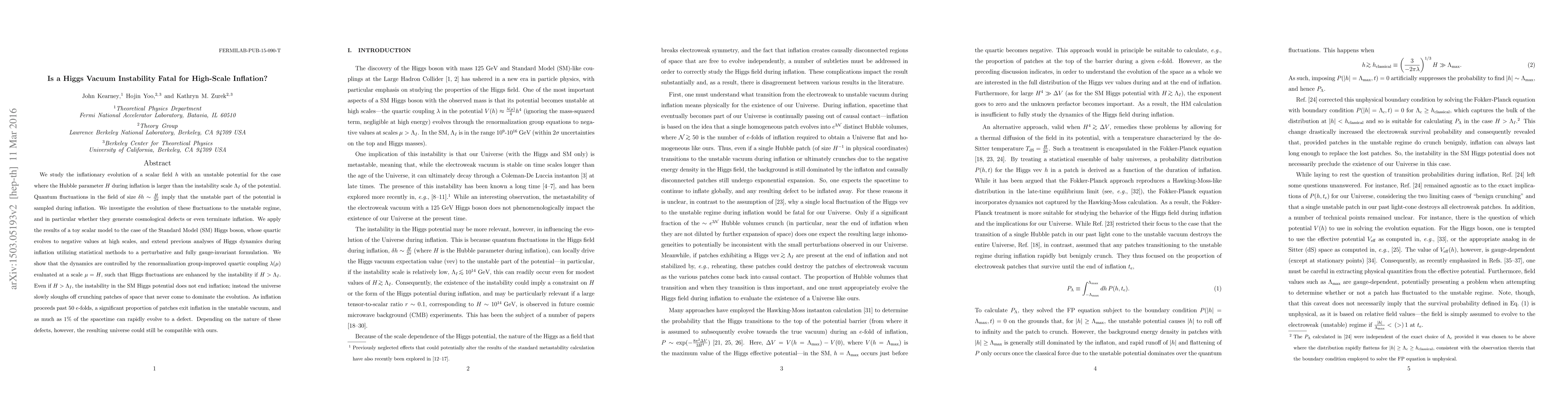 This paper examines whether a Higgs vacuum instability during inflation, where the Hubble parameter exceeds the instability scale, could end inflation or generate cosmological defects. It finds that while the instability enhances Higgs fluctuations, it does not terminate inflation, and only a small fraction of spacetime may evolve into defects, potentially leaving the overall universe compatible with observations.