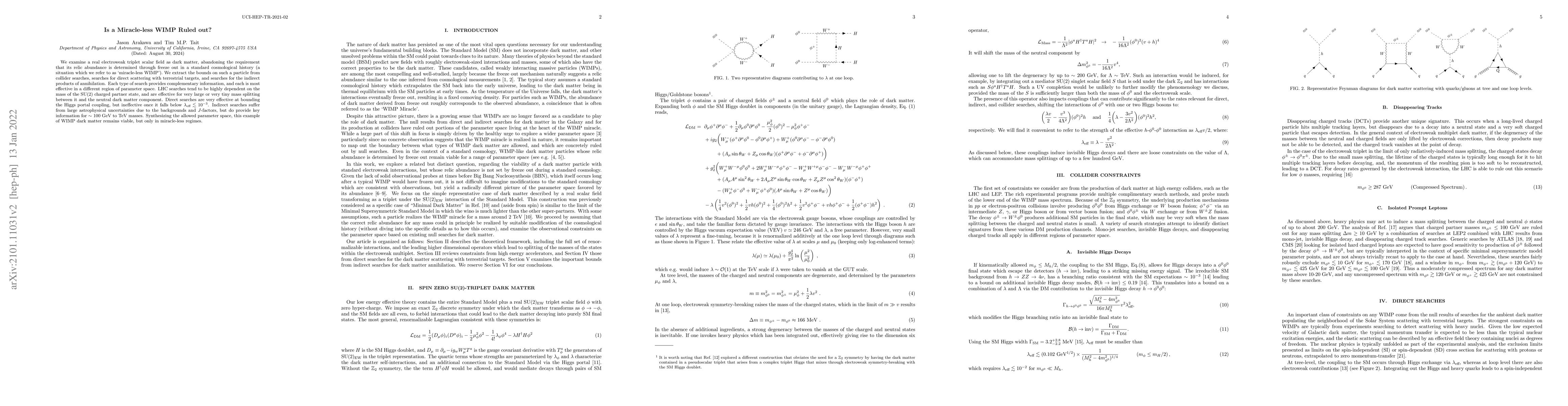 We examine a real electroweak triplet scalar field as dark matter, abandoning the requirement that its relic abundance is determined through freeze out in a standard cosmological history (a situation which we refer to as a 'miracle-less WIMP'). We extract the bounds on such a particle from collider searches, searches for direct scattering with terrestrial targets, and searches for the indirect products of annihilation. Each type of search provides complementary information, and each is most effective in a different region of parameter space. LHC searches tend to be highly dependent on the mass of the SU(2) charged partner state, and are effective for very large or very tiny mass splitting between it and the neutral dark matter component. Direct searches are very effective at bounding the Higgs portal coupling, but ineffective once it falls below $\lambda_{\text{eff}} \lesssim 10^{-3}$. Indirect searches suffer from large astrophysical uncertainties due to the backgrounds and $J$-factors, but do provide key information for $\sim$ 100 GeV to TeV masses. Synthesizing the allowed parameter space, this example of WIMP dark matter remains viable, but only in miracle-less regimes.