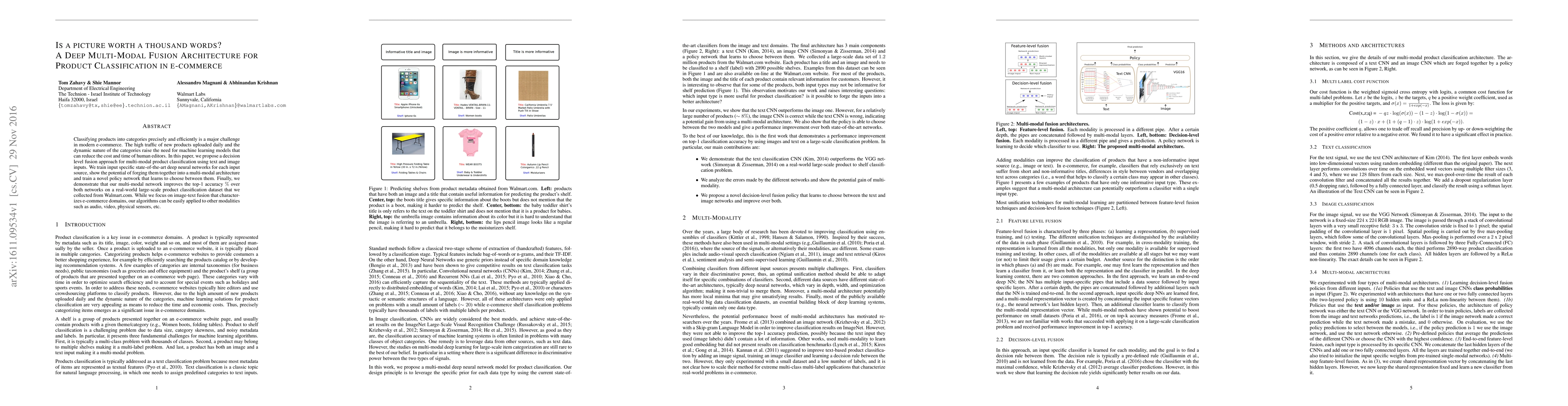 Classifying products into categories precisely and efficiently is a major challenge in modern e-commerce. The high traffic of new products uploaded daily and the dynamic nature of the categories raise the need for machine learning models that can reduce the cost and time of human editors. In this paper, we propose a decision level fusion approach for multi-modal product classification using text and image inputs. We train input specific state-of-the-art deep neural networks for each input source, show the potential of forging them together into a multi-modal architecture and train a novel policy network that learns to choose between them. Finally, we demonstrate that our multi-modal network improves the top-1 accuracy % over both networks on a real-world large-scale product classification dataset that we collected fromWalmart.com. While we focus on image-text fusion that characterizes e-commerce domains, our algorithms can be easily applied to other modalities such as audio, video, physical sensors, etc.