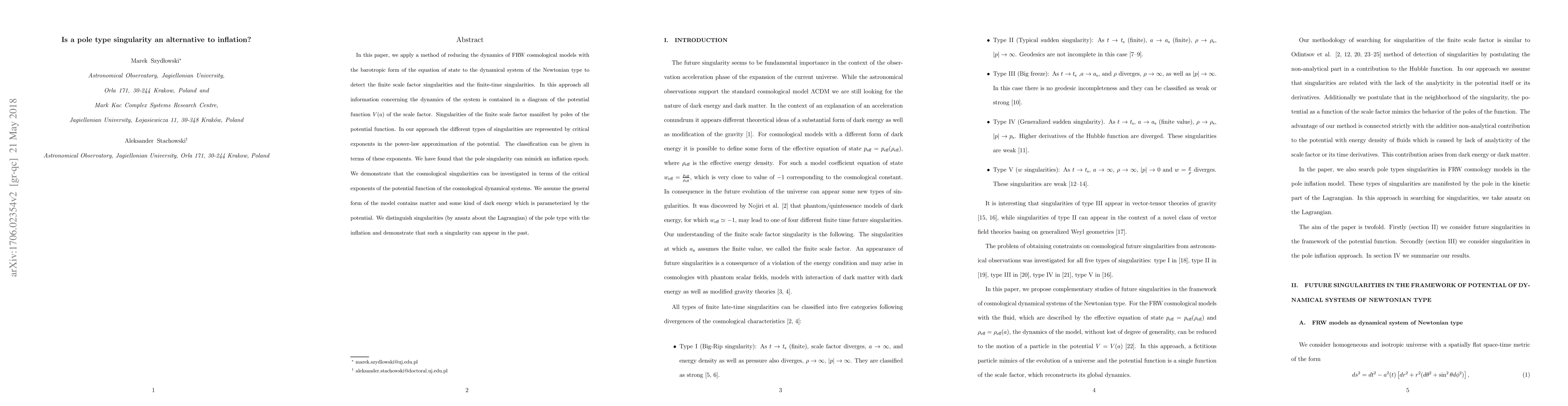 In this paper, we apply a method of reducing the dynamics of FRW cosmological models with the barotropic form of the equation of state to the dynamical system of the Newtonian type to detect the finite scale factor singularities and the finite-time singularities. In this approach all information concerning the dynamics of the system is contained in a diagram of the potential function $V(a)$ of the scale factor. Singularities of the finite scale factor manifest by poles of the potential function. In our approach the different types of singularities are represented by critical exponents in the power-law approximation of the potential. The classification can be given in terms of these exponents. We have found that the pole singularity can mimick an inflation epoch. We demonstrate that the cosmological singularities can be investigated in terms of the critical exponents of the potential function of the cosmological dynamical systems. We assume the general form of the model contains matter and some kind of dark energy which is parameterized by the potential. We distinguish singularities (by ansatz about the Lagrangian) of the pole type with the inflation and demonstrate that such a singularity can appear in the past.