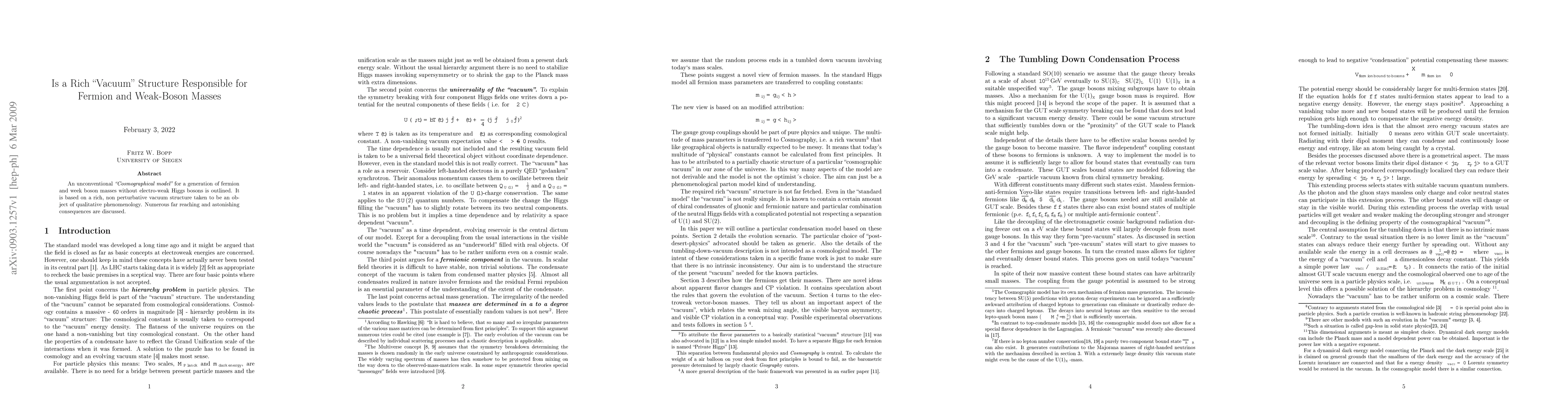 An unconventional Cosmographical model for a generation of fermion and week boson masses without electro-weak Higgs bosons is outlined. It is based on a rich, non perturbative vacuum structure taken to be an object of qualitative phenomenology. Numerous far reaching and astonishing consequences are discussed.