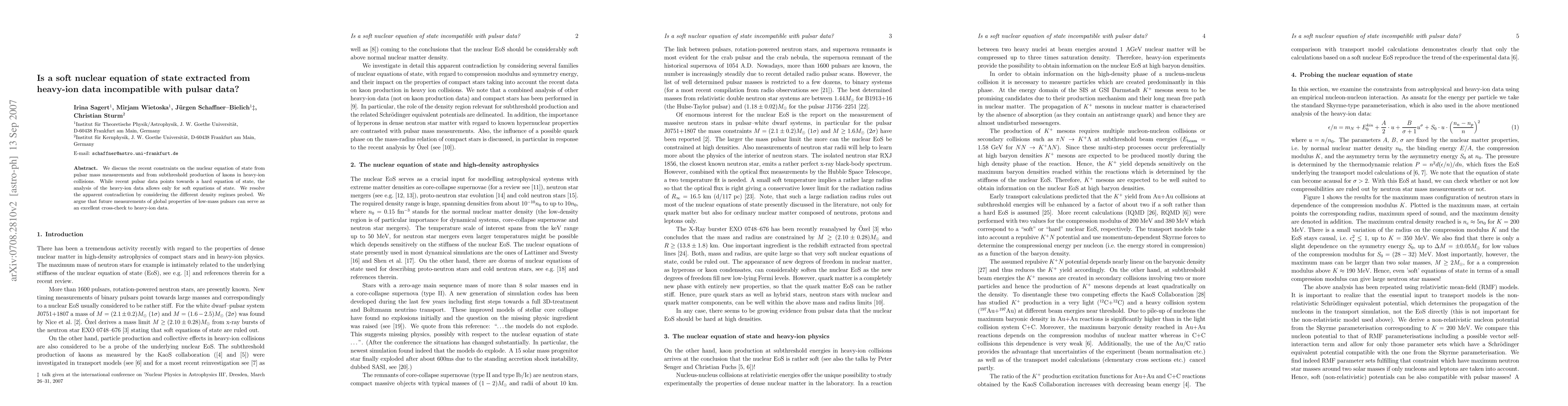 We discuss the recent constraints on the nuclear equation of state from pulsar mass measurements and from subthreshold production of kaons in heavy-ion collisions. While recent pulsar data points towards a hard equation of state, the analysis of the heavy-ion data allows only for soft equations of state. We resolve the apparent contradiction by considering the different density regimes probed. We argue that future measurements of global properties of low-mass pulsars can serve as an excellent cross-check to heavy-ion data.