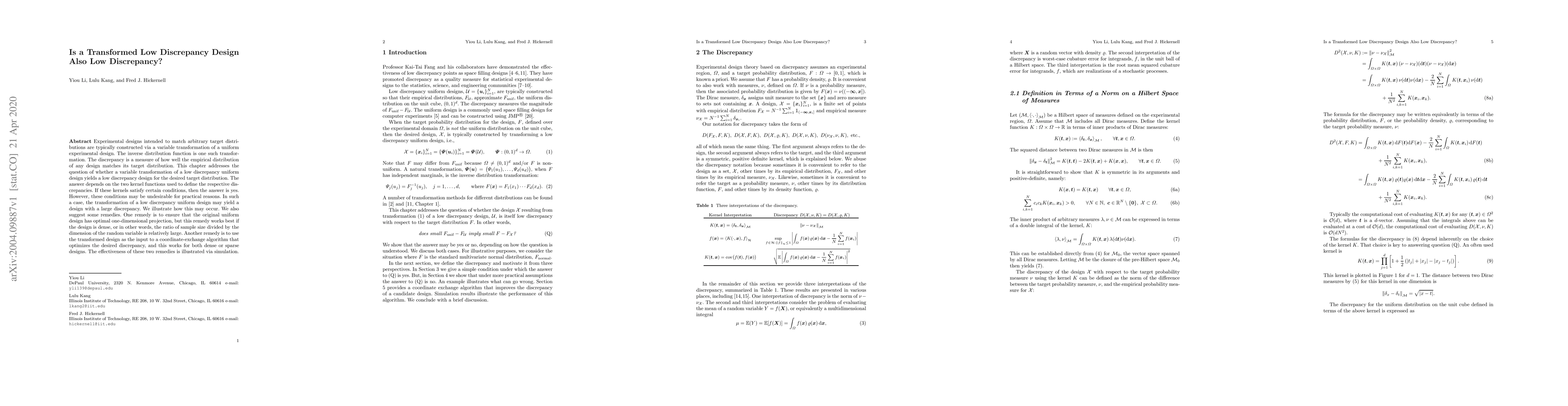 Experimental designs intended to match arbitrary target distributions are typically constructed via a variable transformation of a uniform experimental design. The inverse distribution function is one such transformation. The discrepancy is a measure of how well the empirical distribution of any design matches its target distribution. This chapter addresses the question of whether a variable transformation of a low discrepancy uniform design yields a low discrepancy design for the desired target distribution. The answer depends on the two kernel functions used to define the respective discrepancies. If these kernels satisfy certain conditions, then the answer is yes. However, these conditions may be undesirable for practical reasons. In such a case, the transformation of a low discrepancy uniform design may yield a design with a large discrepancy. We illustrate how this may occur. We also suggest some remedies. One remedy is to ensure that the original uniform design has optimal one-dimensional projection, but this remedy works best if the design is dense, or in other words, the ratio of sample size divided by the dimension of the random variable is relatively large. Another remedy is to use the transformed design as the input to a coordinate-exchange algorithm that optimizes the desired discrepancy, and this works for both dense or sparse designs. The effectiveness of these two remedies is illustrated via simulation.