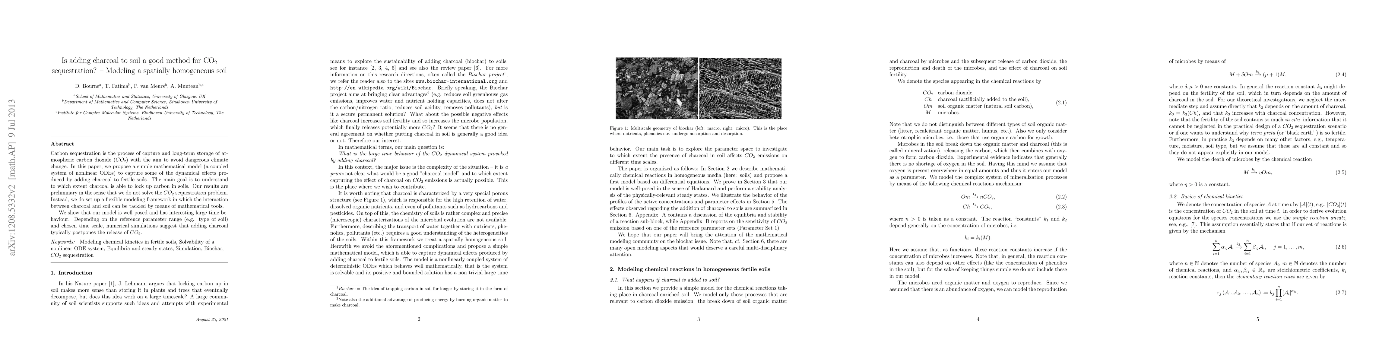 This paper proposes a mathematical model to study the effects of adding charcoal to soil for CO2 sequestration, showing that charcoal can delay CO2 release. The model provides a flexible framework for further investigation into the interaction between charcoal and soil.