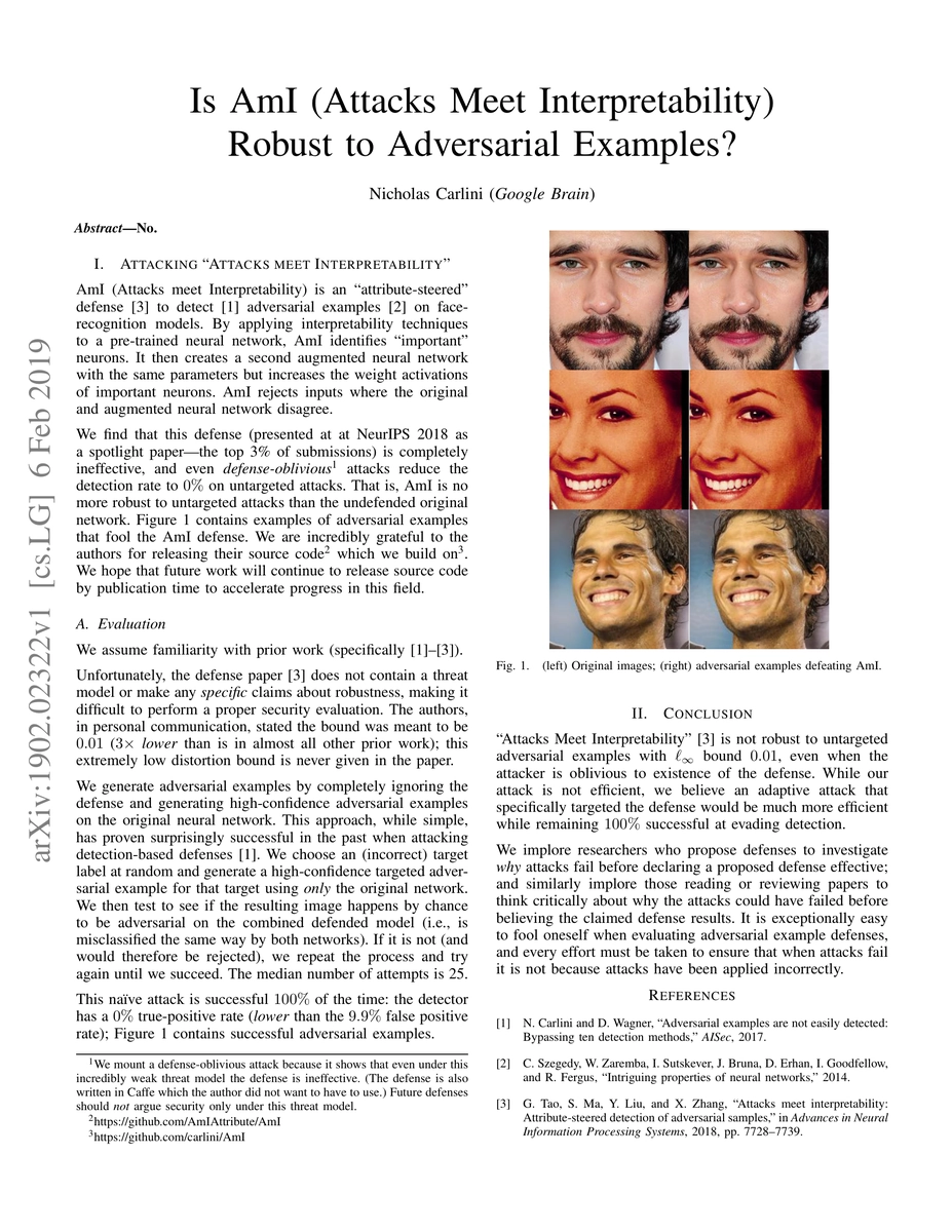 Summary: The study concludes that AmI (Attacks Meet Interpretability) is not robust against adversarial examples, indicating vulnerabilities in its interpretability when faced with such challenges. This finding highlights the need for improved defenses against adversarial attacks in interpretability frameworks.