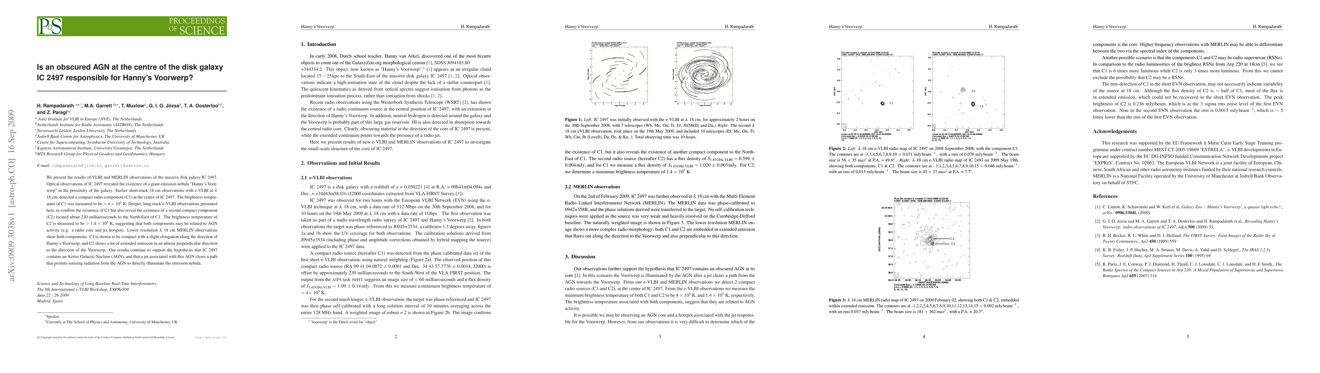 We present the results of VLBI and MERLIN observations of the massive disk galaxy IC 2497. Optical observations of IC 2497 revealed the existence of a giant emission nebula "Hanny's Voorwerp" in the proximity of the galaxy. Earlier short-track 18 cm observations with e-VLBI at 18 cm, detected a compact radio component (C1) at the centre of IC 2497. The brightness temperature of C1 was measured to be greater than 4E5 K. Deeper, long-track e-VLBI observations presented here, re-confirm the existence of C1 but also reveal the existence of a second compact component (C2) located about 230 milliarcseconds to the North-East of C1. The brightness temperature of C2 is measured to be greater than 1.4E5 K, suggesting that both components may be related to AGN activity (e.g. a radio core and jet hotspot). Lower resolution 18cm MERLIN observations show both components. C1 is shown to be compact with a slight elongation along the direction of Hanny's Voorwerp, and C2 shows a lot of extended emission in an almost perpendicular direction to the direction of the Voorwerp. Our results continue to support the hypothesis that IC 2497 contains an Active Galactic Nucleus (AGN), and that a jet associated with this AGN clears a path that permits ionising radiation from the AGN to directly illuminate the emission nebula.