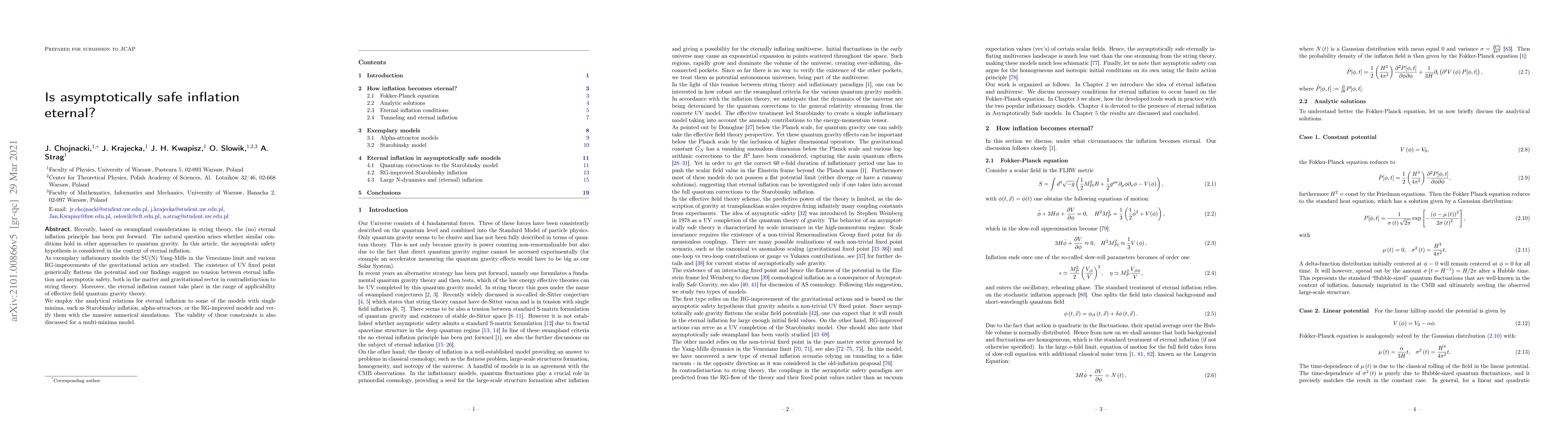 This paper investigates the compatibility of eternal inflation with the asymptotic safety hypothesis in quantum gravity, finding no tension between the two in contrast to string theory. It concludes that eternal inflation cannot occur within the range of effective field quantum gravity theory, supported by both analytical relations and numerical simulations.